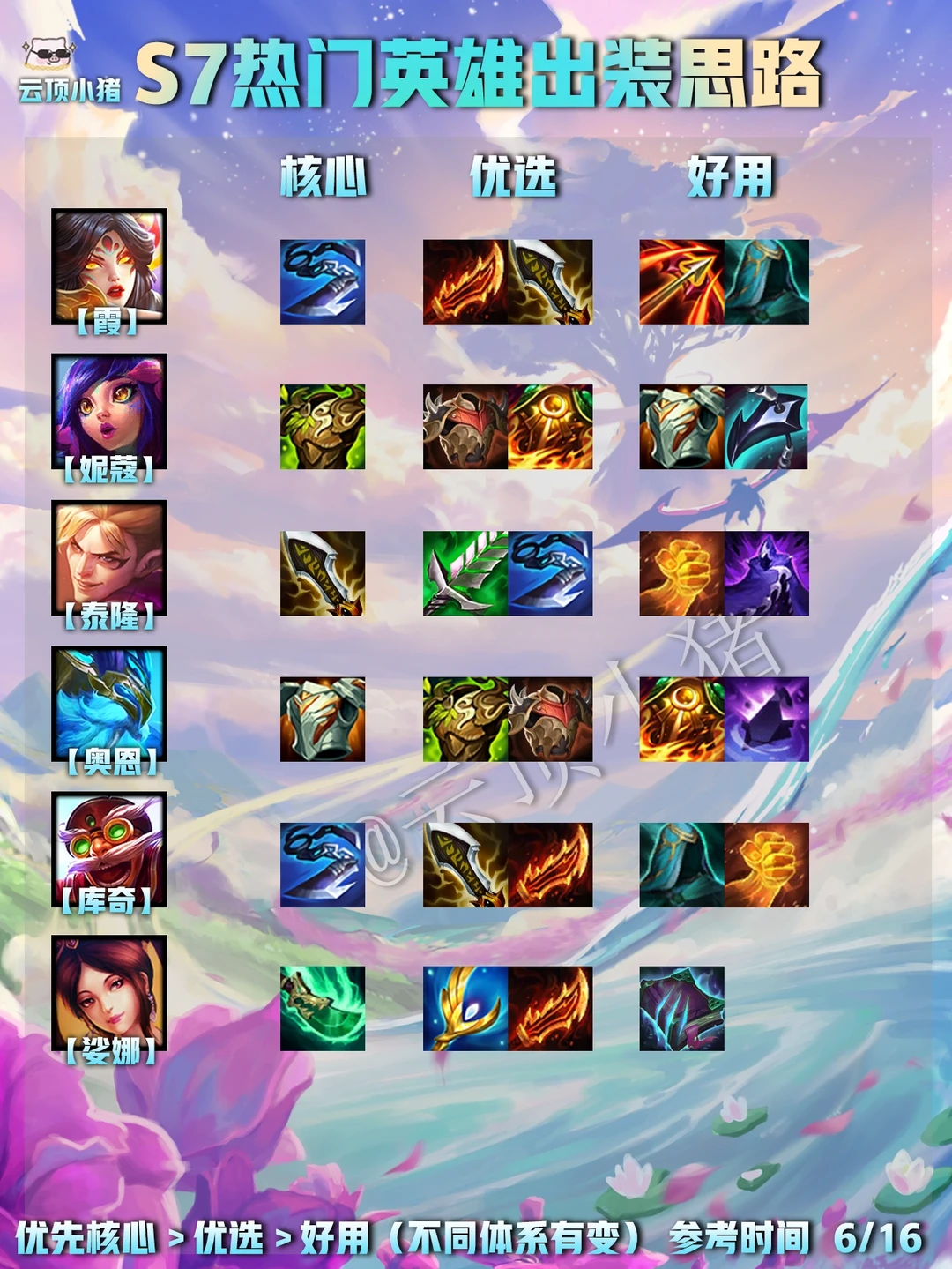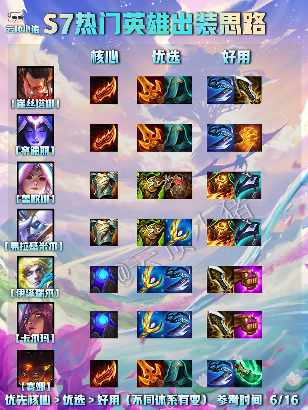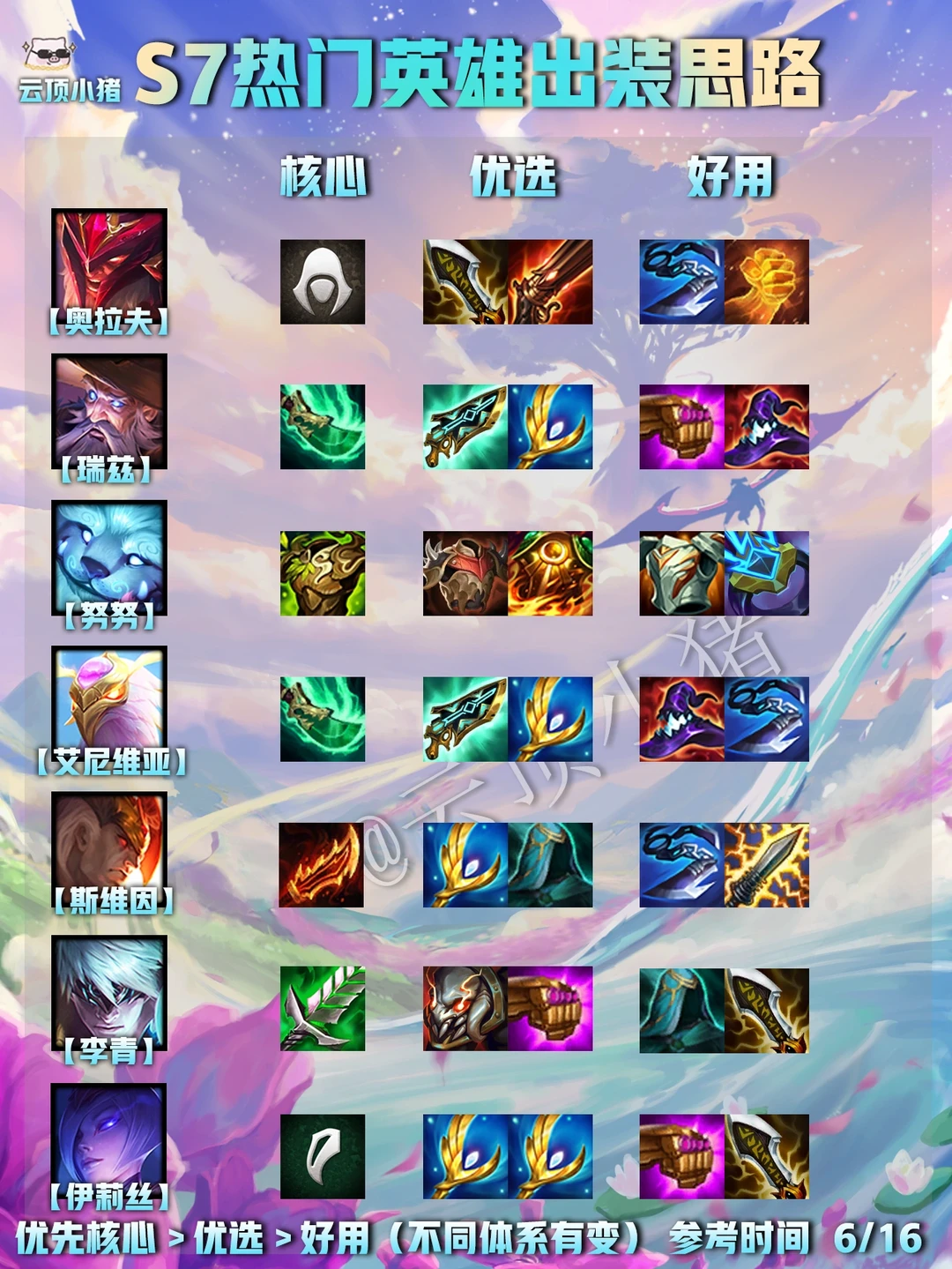 [害羞R]大家好鸭,我是小猪~ 嘿嘿,今天金铲铲S7赛季也正式开始啦! [赞R]这次的出装思路是实战一周结合各平台王者大神的思路汇总,参考价值很高。 [害羞R]刚上手的小伙伴直接三连抄作业就行啦~ 核心是性价比最高最关键的,优选是第二三件,好用是很适合,有就做不用等待的装备