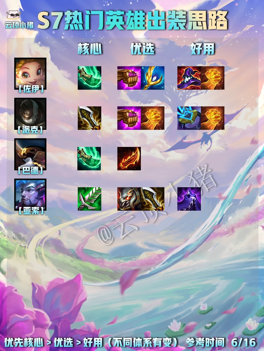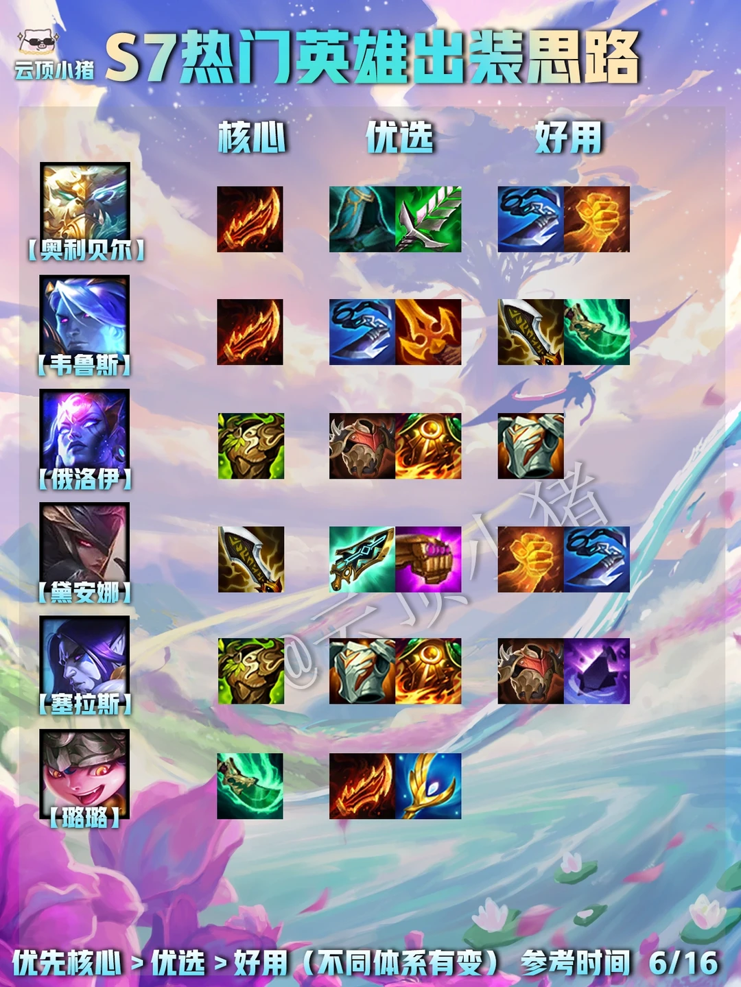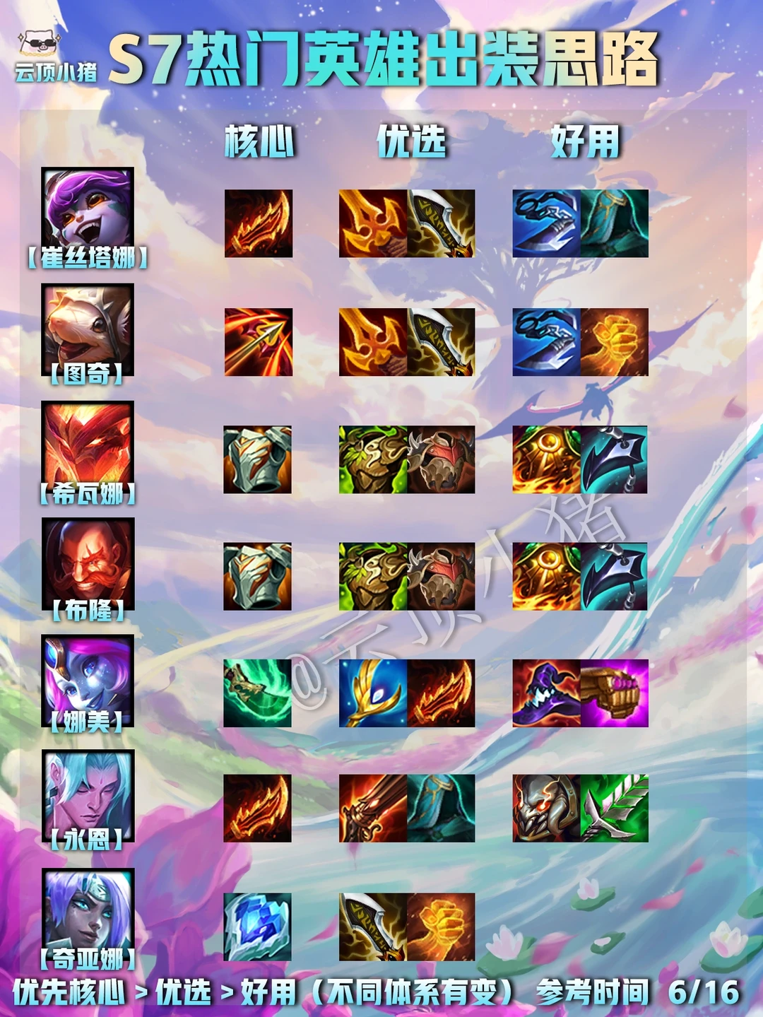 [害羞R]大家好鸭,我是小猪~ 嘿嘿,今天金铲铲S7赛季也正式开始啦! [赞R]这次的出装思路是实战一周结合各平台王者大神的思路汇总,参考价值很高。 [害羞R]刚上手的小伙伴直接三连抄作业就行啦~ 核心是性价比最高最关键的,优选是第二三件,好用是很适合,有就做不用等待的装备