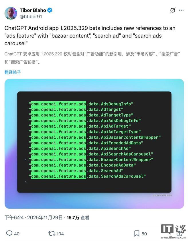 根据X平台用户Tibor的发现,ChatGPT安卓端1.2025.329测试版出现了新的相关字段,包括“bazaarcontent(集市内容)”“searchad(搜索广告)”和“searchadscarousel(搜索广告轮播)”,显示广告功能正在准备当中。
