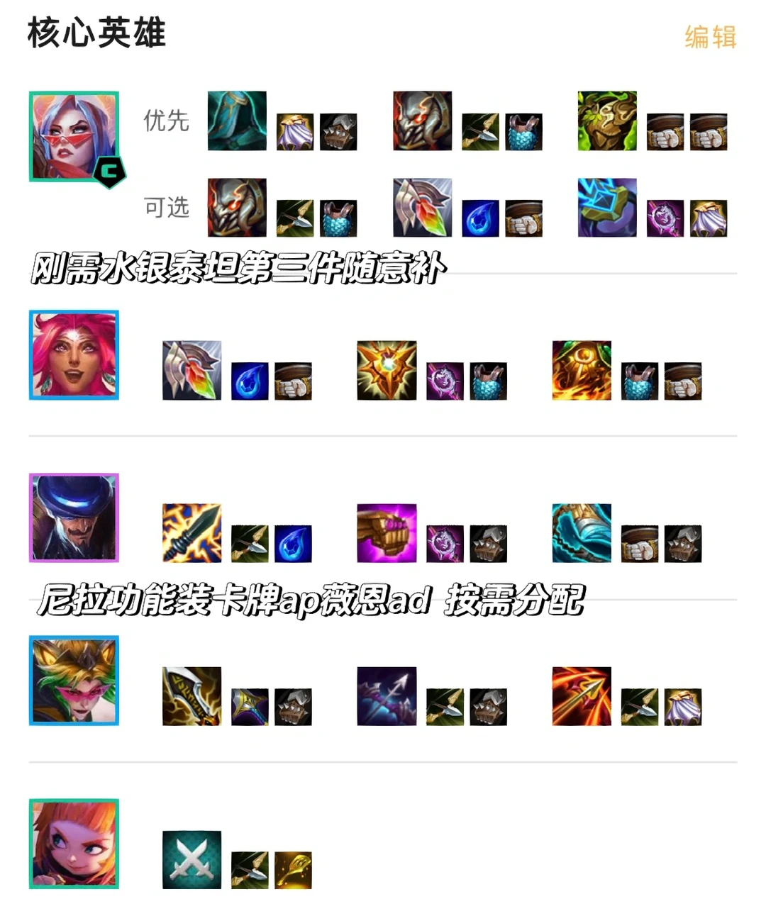 多余装备优先给卡牌找法装,AD装给VN,尼菈捡肉装和功能装,这套鸟盾做不做都无所谓,有就合。