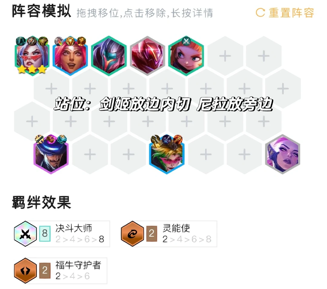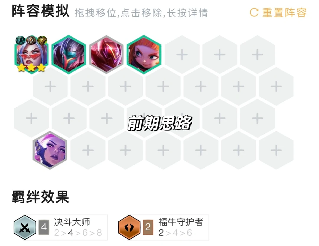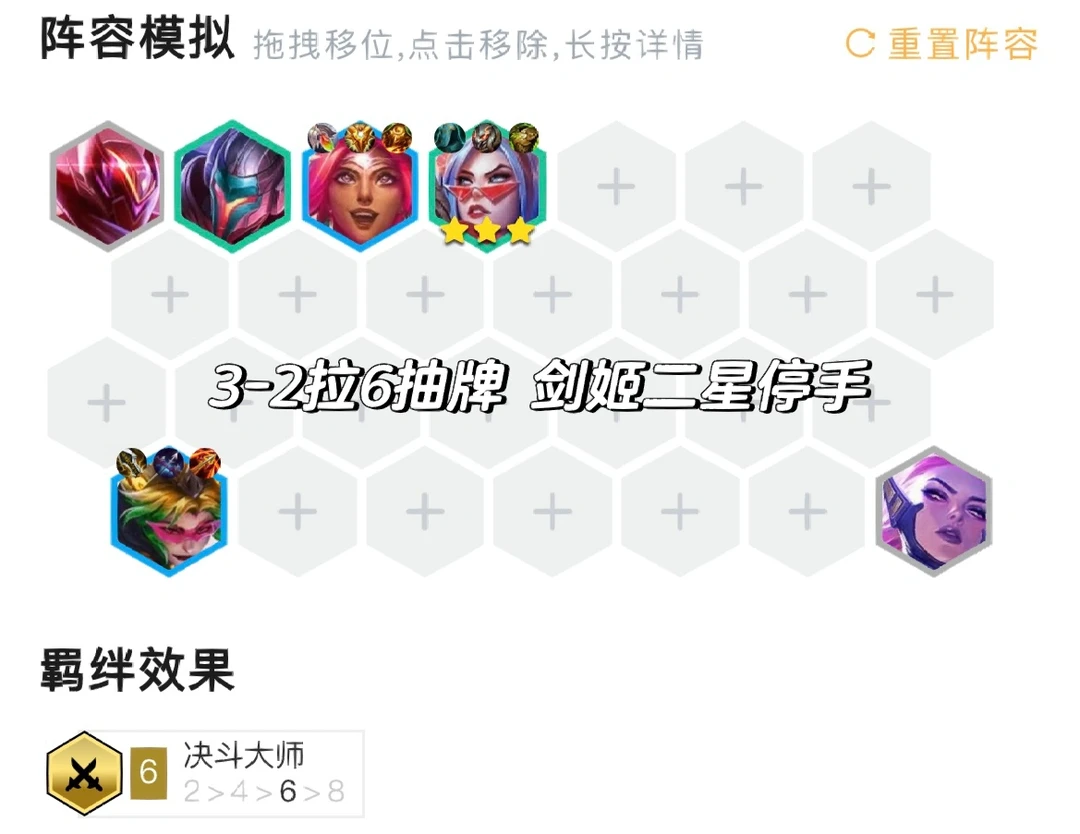 前期就4决斗配2福牛,有1-2件装备或者鸟盾几乎能连胜上6,6人口就启动了,直接硬抽6决斗,二星剑姬无脑连胜,然后先把体系牌全部抽到二星,然后卡利息追三星。