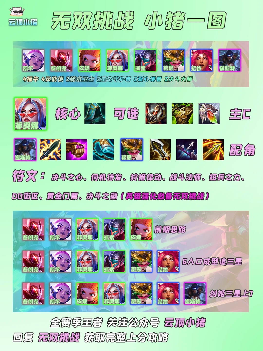 [氛围感R]这个版本很多羁绊和棋子强化都重做和改动了,今天就给大家推荐一套拿到100%吃分的超模强化--无双挑战,拿到就吃分,稍微顺一点就前二。小猪测试服玩了4把,3把第一,一把第二。