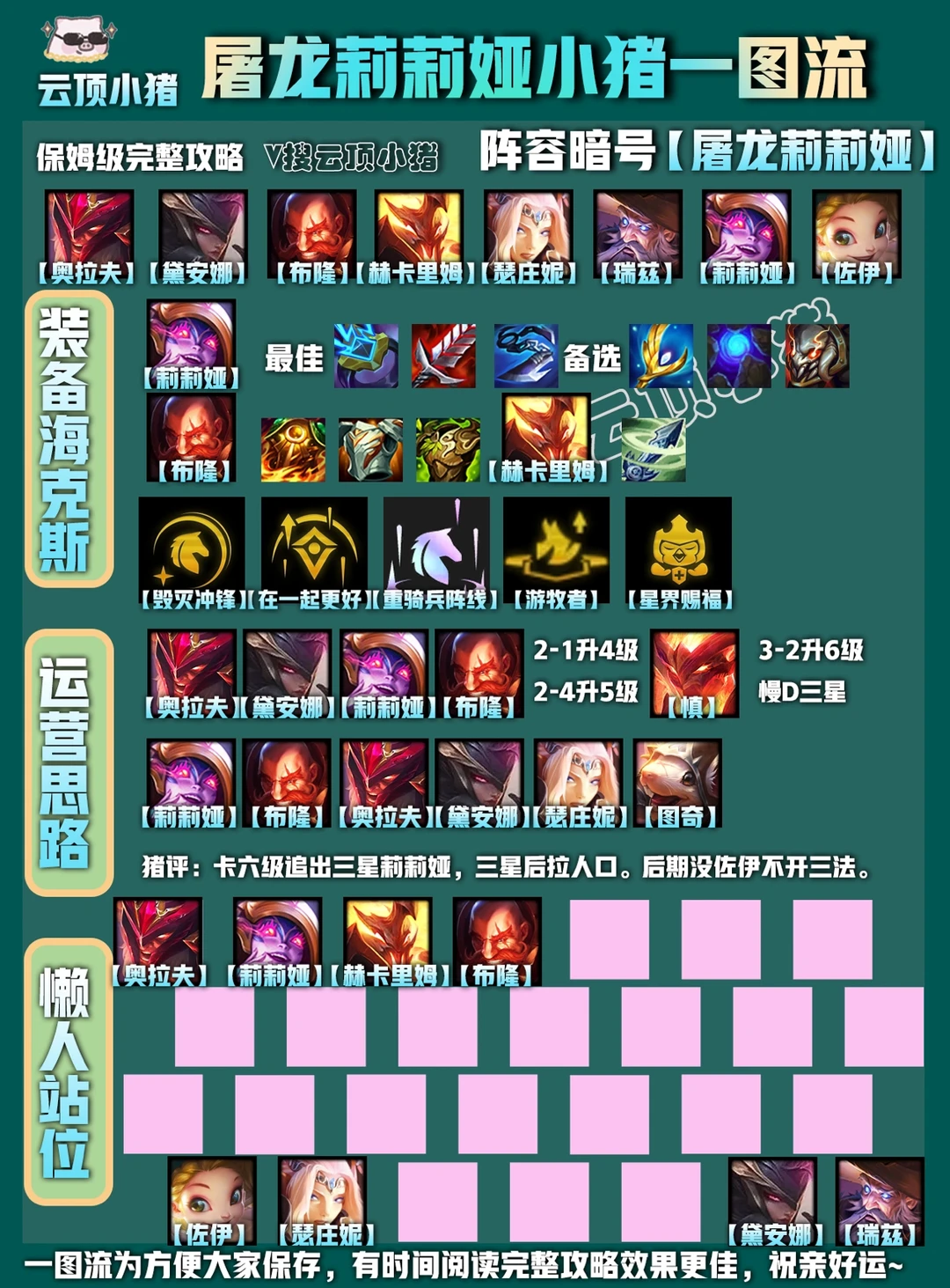 连胜开局最好,一般2-1拉4人口,2-5拉5人口,3-2拉6人口,3-2升六,小D质量,至少抽出4屠龙和二星莉莉娅,然后存钱,卡30左右利息追出三星莉莉娅,布隆。