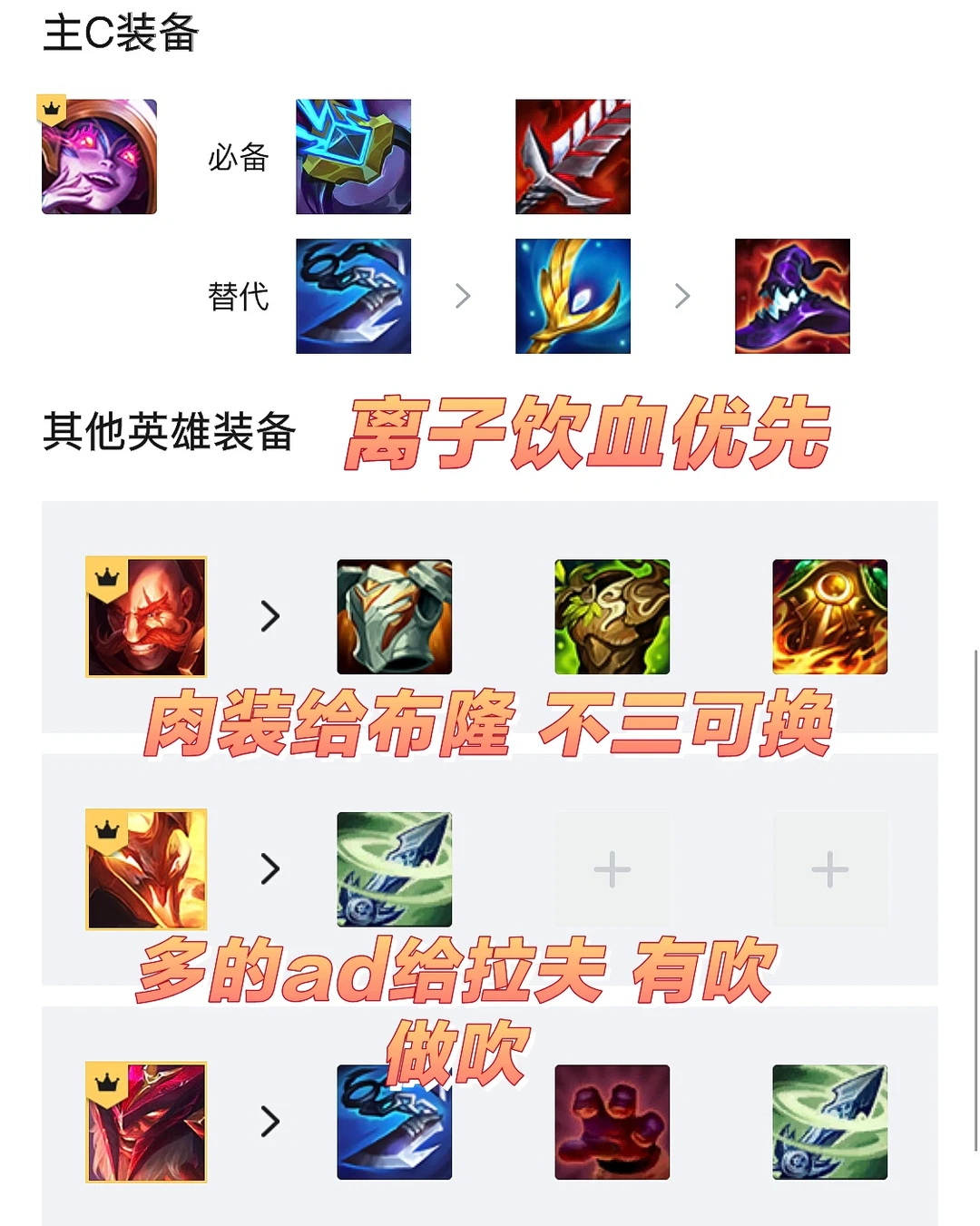 离子必备很关键,其次饮血是续航,有回复符文可不出,巨杀是过前排好用,其他看情况补就好。肉装全部给到布隆,多余AD装备给拉夫,有功能装优先做灵风吹前排。