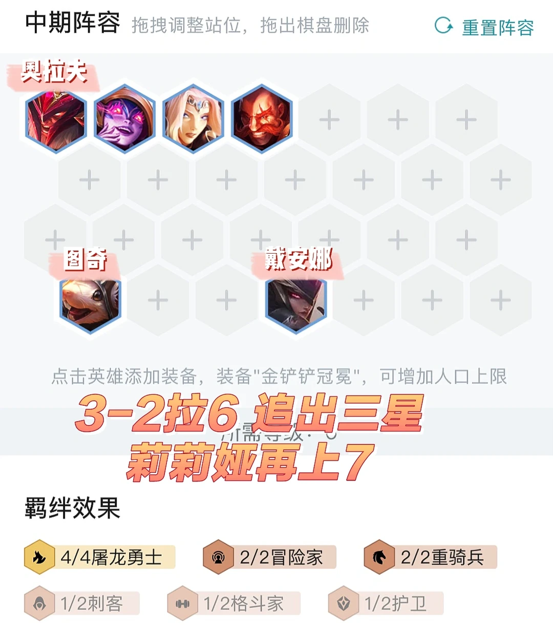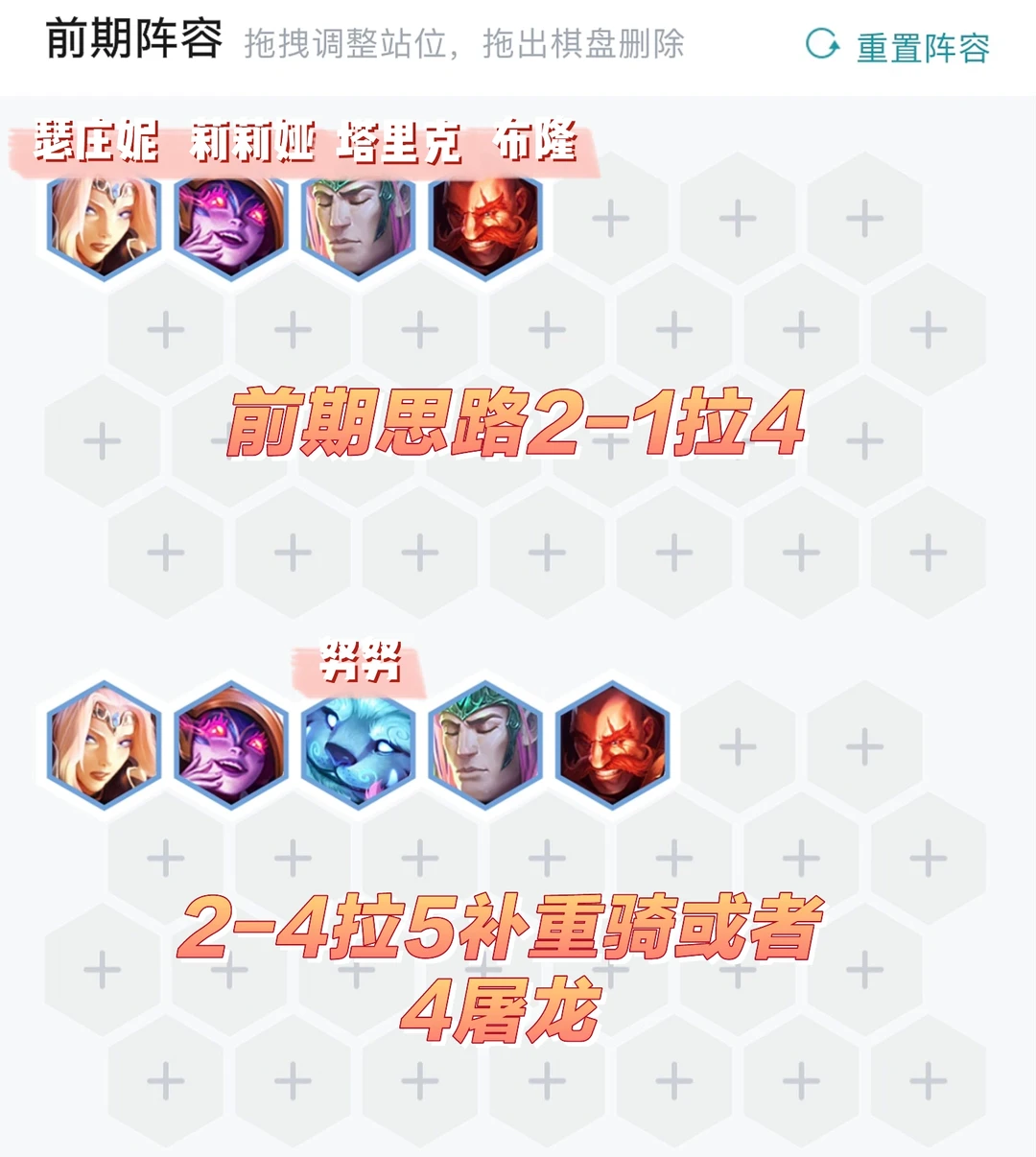 前期有莉莉娅就用莉莉娅配二屠龙二护卫或者二都是,运气特别好就4屠龙带2重骑兵。