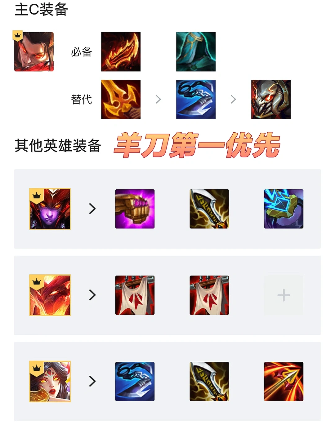 水银羊刀必备,第三件杀人剑最好,其次巨杀、三项、泰坦也OK。优先做腕豪的,其他人随缘,三阶段腕豪必须要两件成装以上,要不连胜不了。