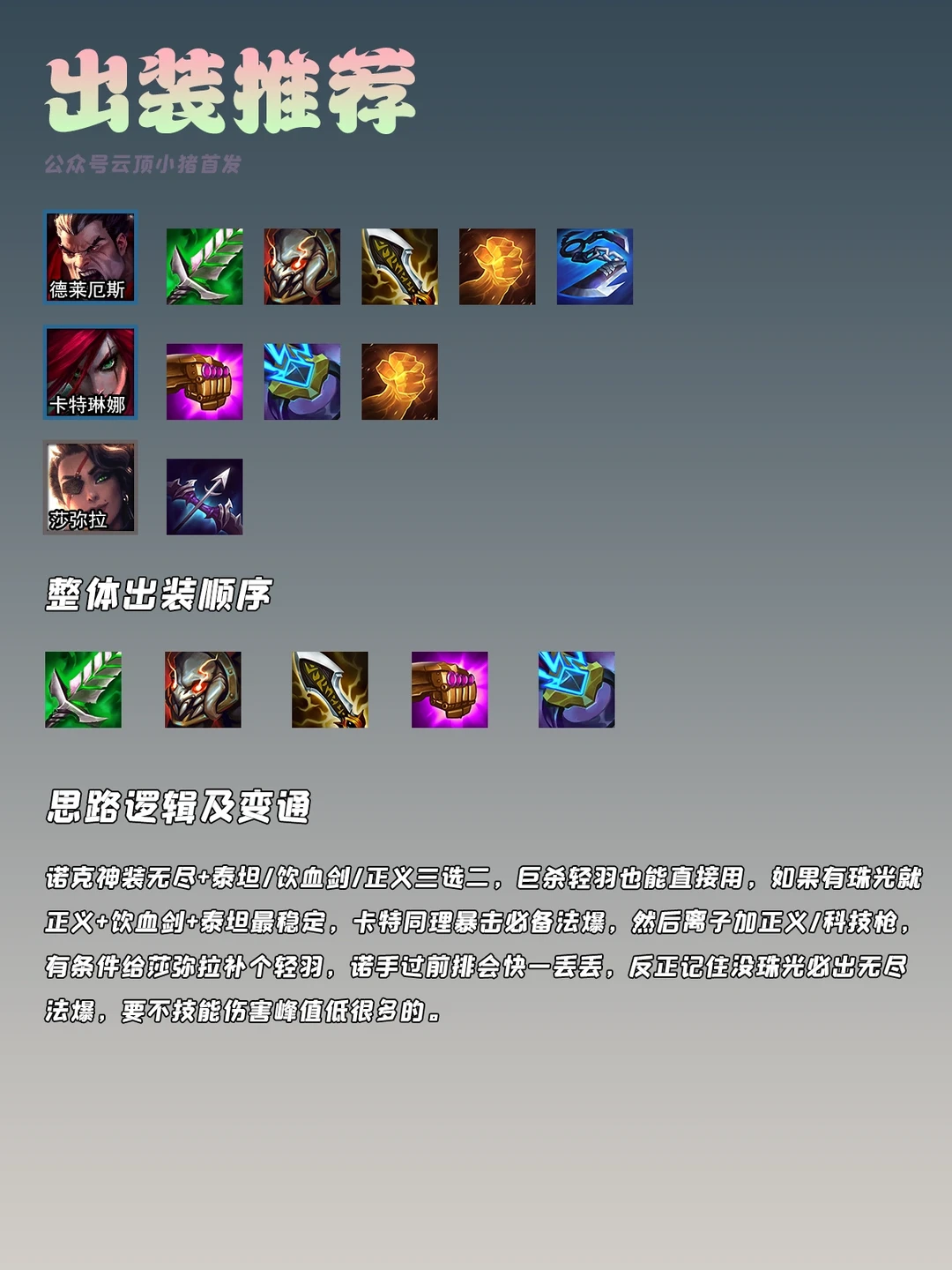 装备思路:诺克神装无尽+泰坦/饮血剑/正义三选二,巨杀轻羽也能直接用,如果有珠光就正义+饮血剑+泰坦最稳定,卡特同理暴击必备法爆,然后离子加正义/科技枪.