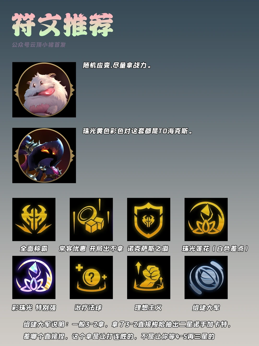 3、战力海克斯决定上限,珠光是这套最强的战力海,白色的差了点,所以也能带小法的英雄之力,经济海克斯可以拿诺克萨斯之徽(省一个人口,理解为经济)、常客优惠(开局不拿,会比较被动,容易连败)。
