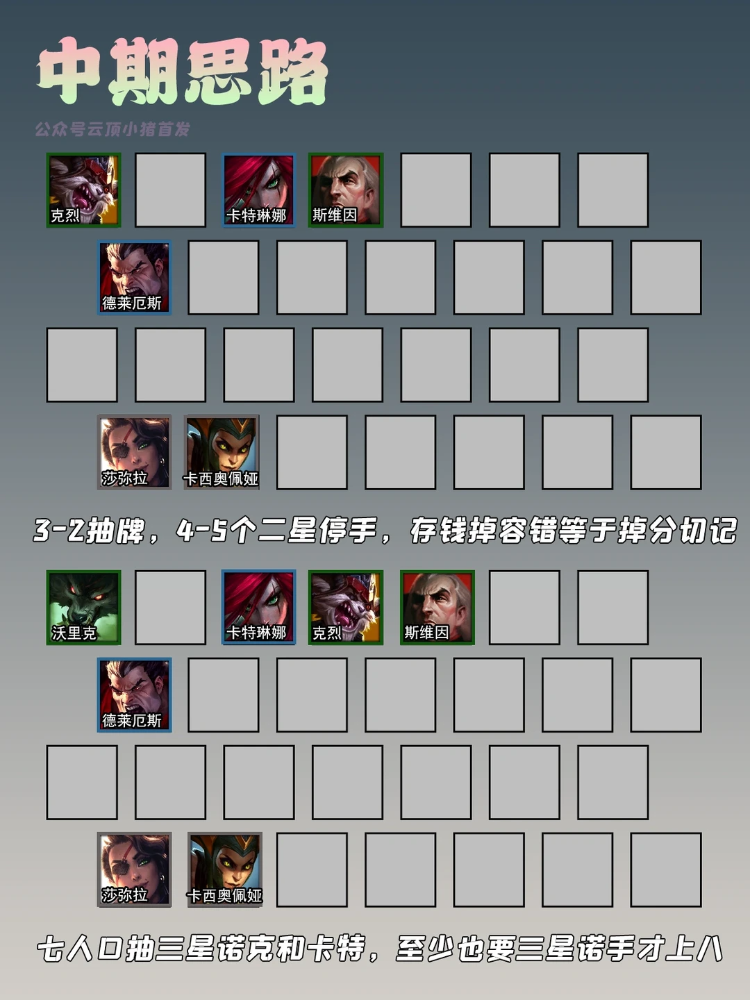 正常开局拉4,2-5拉5人口,3-2拉6人口抽牌,抽到4个以上二星加三诺or六诺,就可以停手了,听三费诺手和卡特可以抽空,因为我们必须保证三阶段连胜,否则你就是掉分的局。