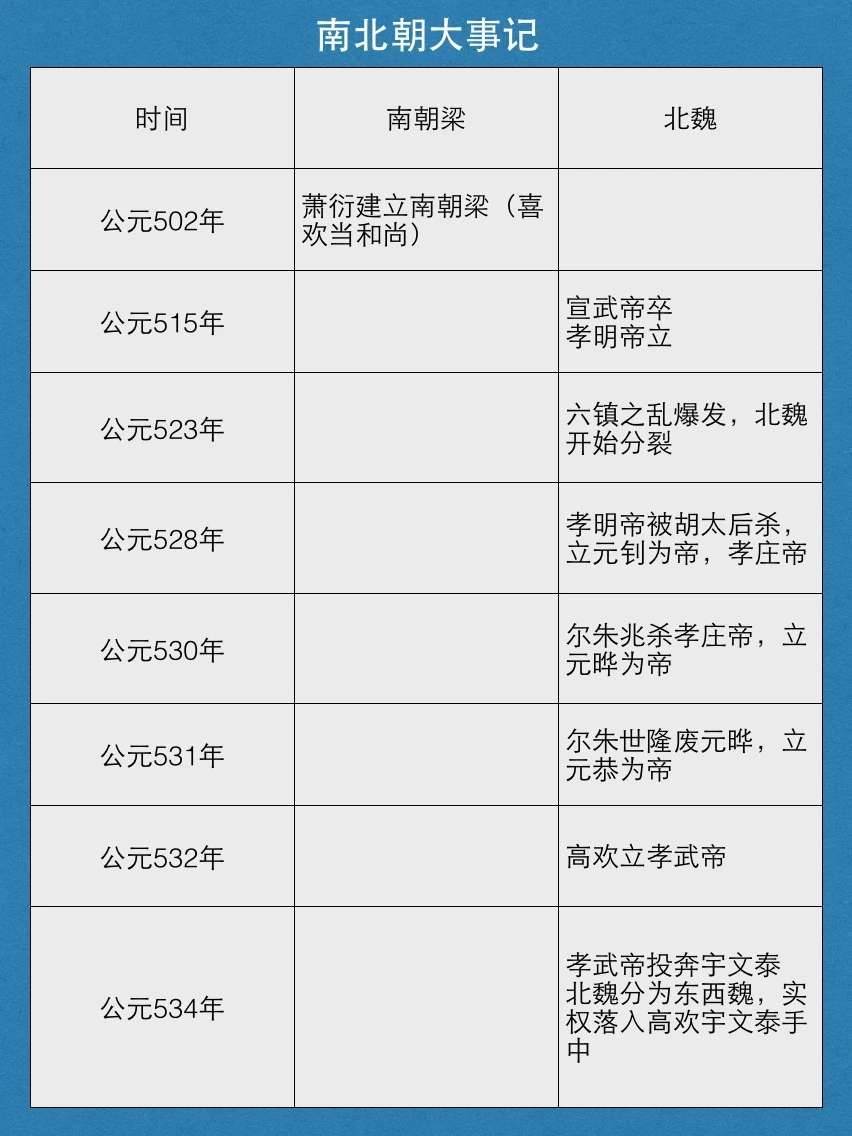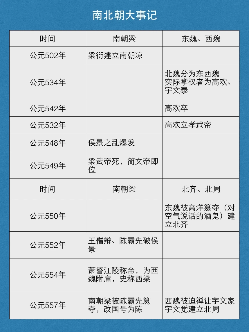 萧衍建立了南梁,但他最大的愿望是当和尚,数次出家都要花大价钱才能赎出来。之后南梁也不消停,爆发了侯景之乱、梁武帝被饿死、王陈两大权臣之争等等,最终陈霸先获胜、建立了南陈。