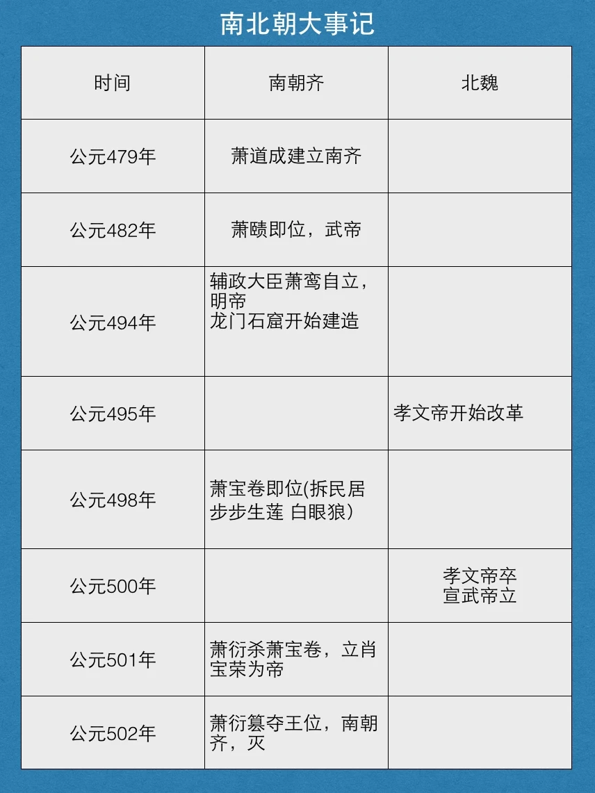 南齐建立,皇帝是南宋权臣萧道成,他和儿子开启了永明之治,却因孙子的昏君做派毁于一旦。此后萧鸾政变、操纵两任皇帝终于上位,但他的儿子萧宝卷不仅热衷搞事,出门就拆民居,还是个白眼狼,杀了为自己平叛兵变的尚书令萧懿。