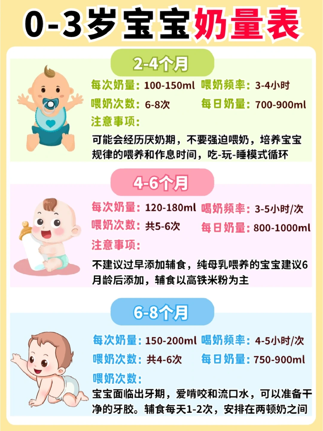 ✔️今天给大家总结了0-3岁宝宝奶量规律表,以及宝宝喂养注意事项,赶快码住吧!