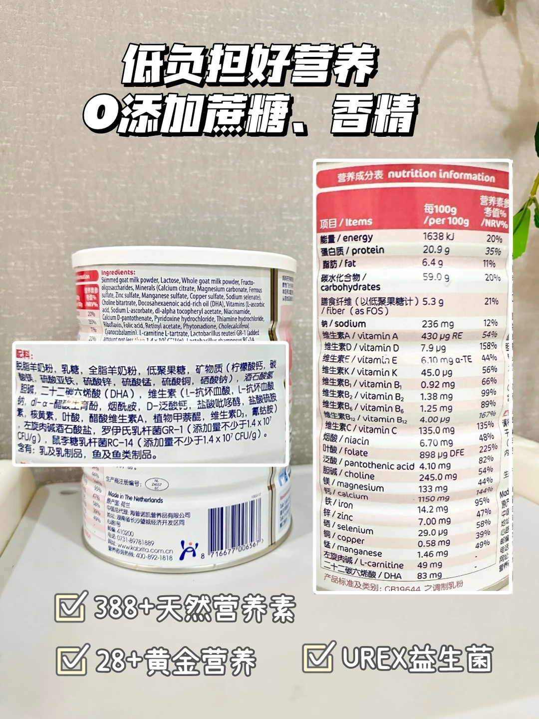 ✔️这款奶粉中有不仅有羊奶的388+天然营养素,还特别添加28+黄金营养素,营养超全,省去每天定时定点补充大瓶小瓶的各种营养素的麻烦!加上UREX益生菌的助力,可以维护我们的私处菌群平衡,孕期产检的时候,一路绿灯,胎儿和孕妈各项指标都很正常!