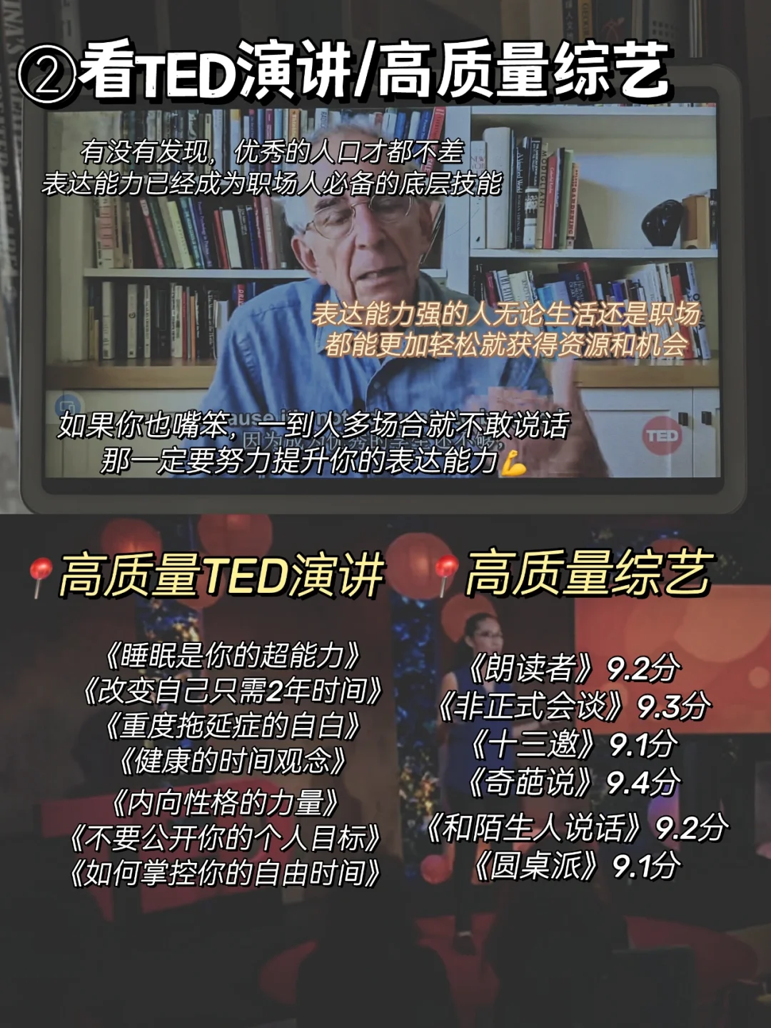 2⃣看TED/高质量综艺:有一个好的表达能力,会让你在生活和工作中都得到更多机会。