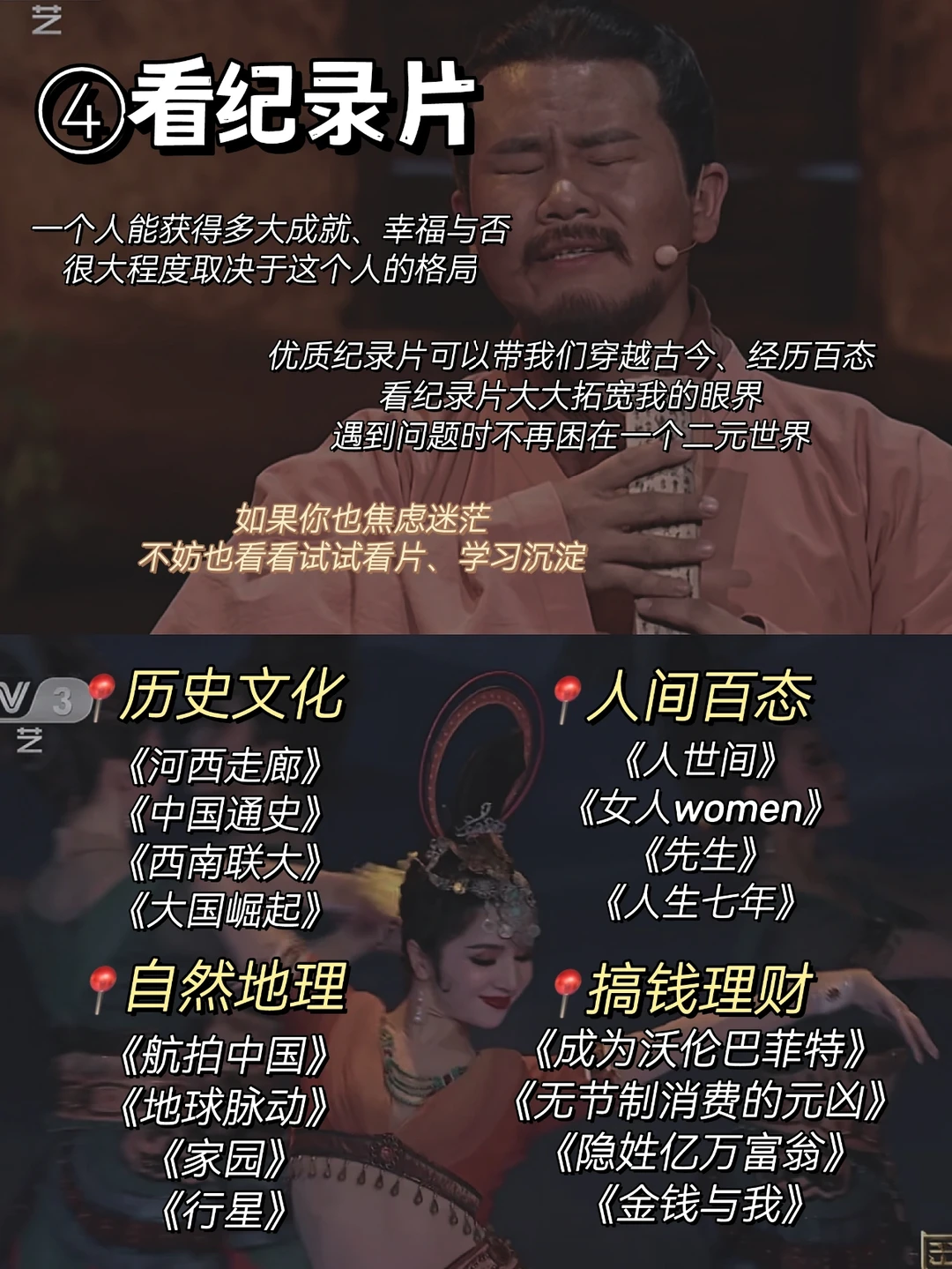 3⃣看纪录片:纪录片很神奇,能带你穿越古今,看到你未曾想象过的世界,狠狠提升格局。