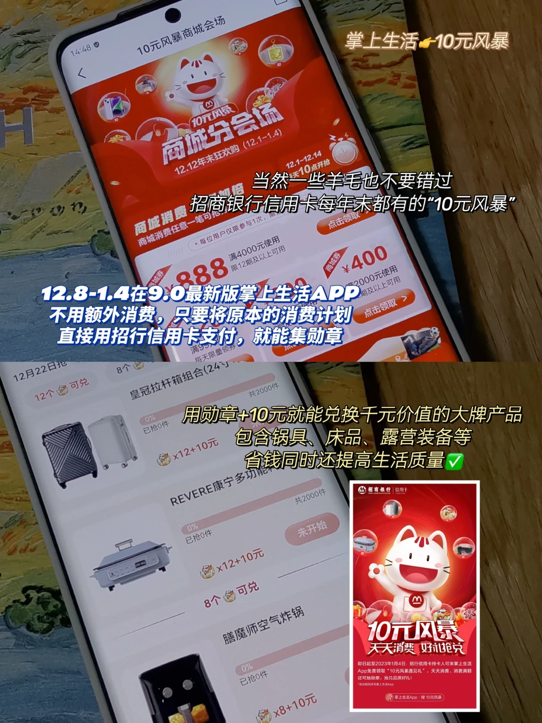 当然一些羊毛也不要错过,像招商银行信用卡每年末都有的“10元风暴”,12.8-明年1.4在9.0最新版掌上生活APP,不用额外消费,只需要将原本的消费计划用招行信用卡支付,就能集勋章10元抢兑千元价值的大牌锅具、床品、露营装备等礼品,省钱同时还提高生活质量。