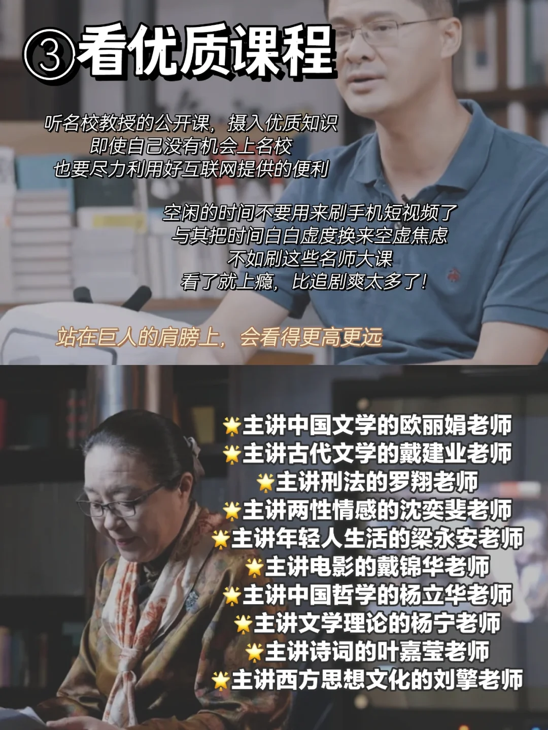 4⃣看优质课程:我们可能没机会去清华北大,但可以借助互联网听到老师的课,站在巨人肩膀可看得更远。