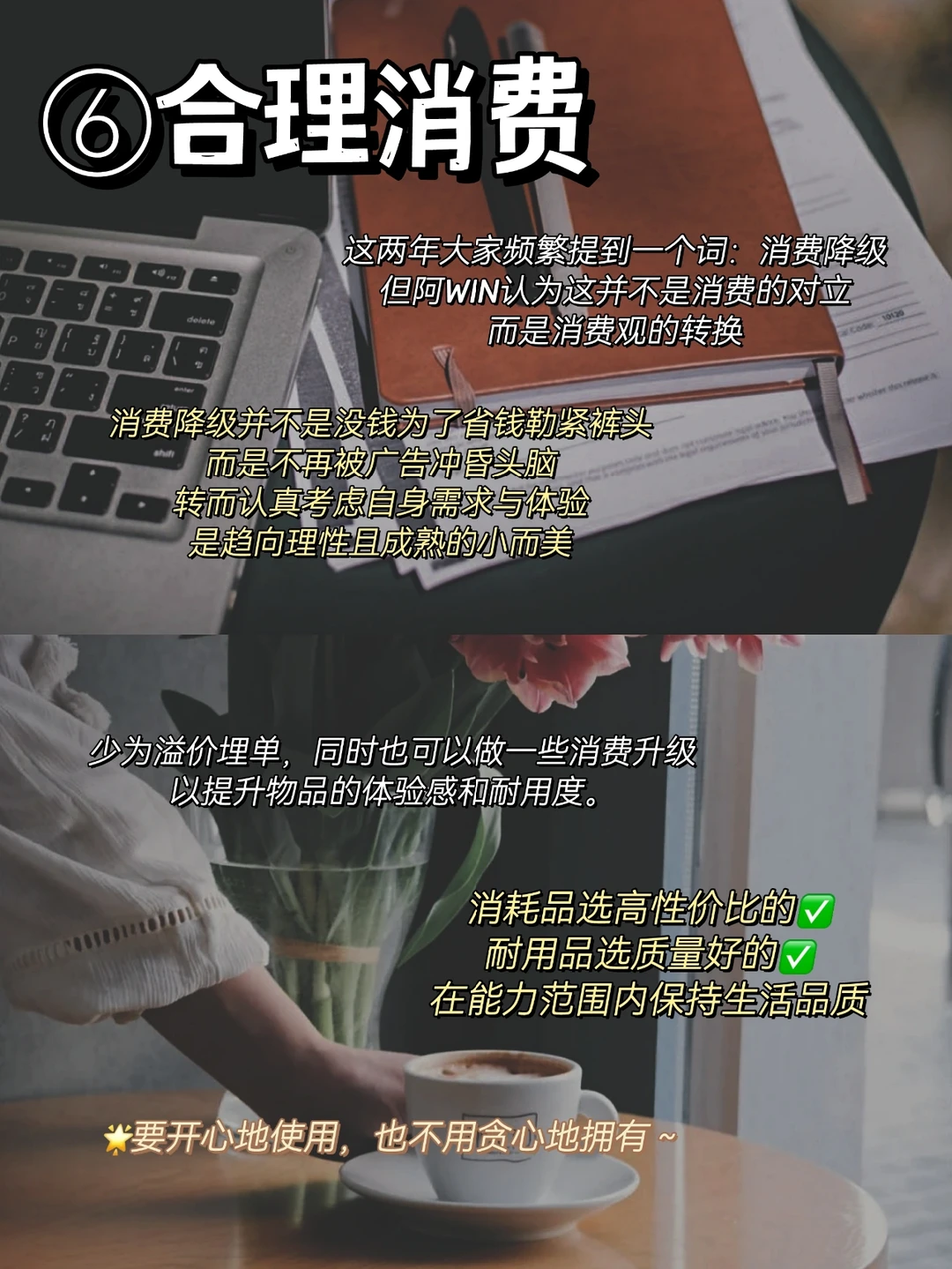 6⃣理智消费:学会有效消费,消耗品选高性价比的,耐用品选质量好的,在能力范围内保持生活品质。