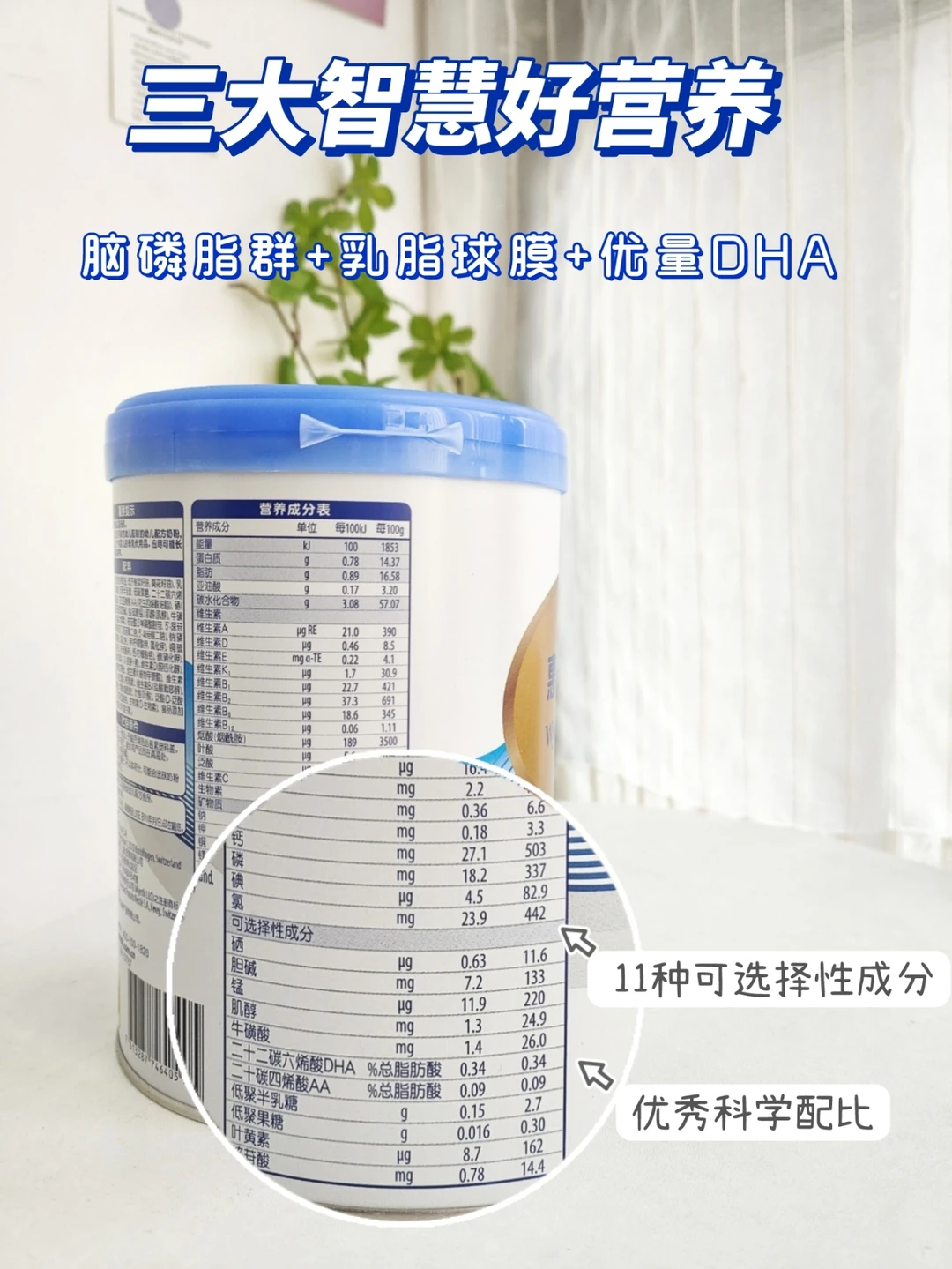 💯特别是惠氏S-26铂臻含有以脑磷脂群领衔的3大智慧好营养组合: