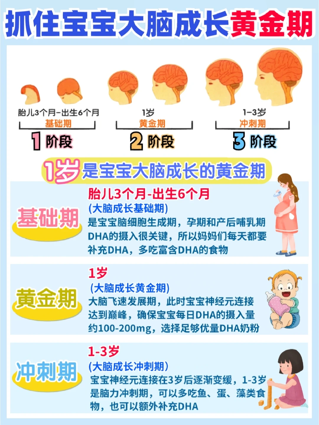 🧠0~3岁是宝宝的脑动力成长黄金期,1岁时动作、语言、认知相关的神经元以每秒超百万的惊人速度建立连接,而大脑是一切机体活动的中枢,宝宝说话、走路、社交、反应、认知等各方面的能力会在此时快速发展,抓住宝宝1岁的成长黄金期,给宝宝打好营养基础非常重要,在此呼吁家长们,注重宝宝身高体重达标的同时,更应该重视宝宝的大脑情况!