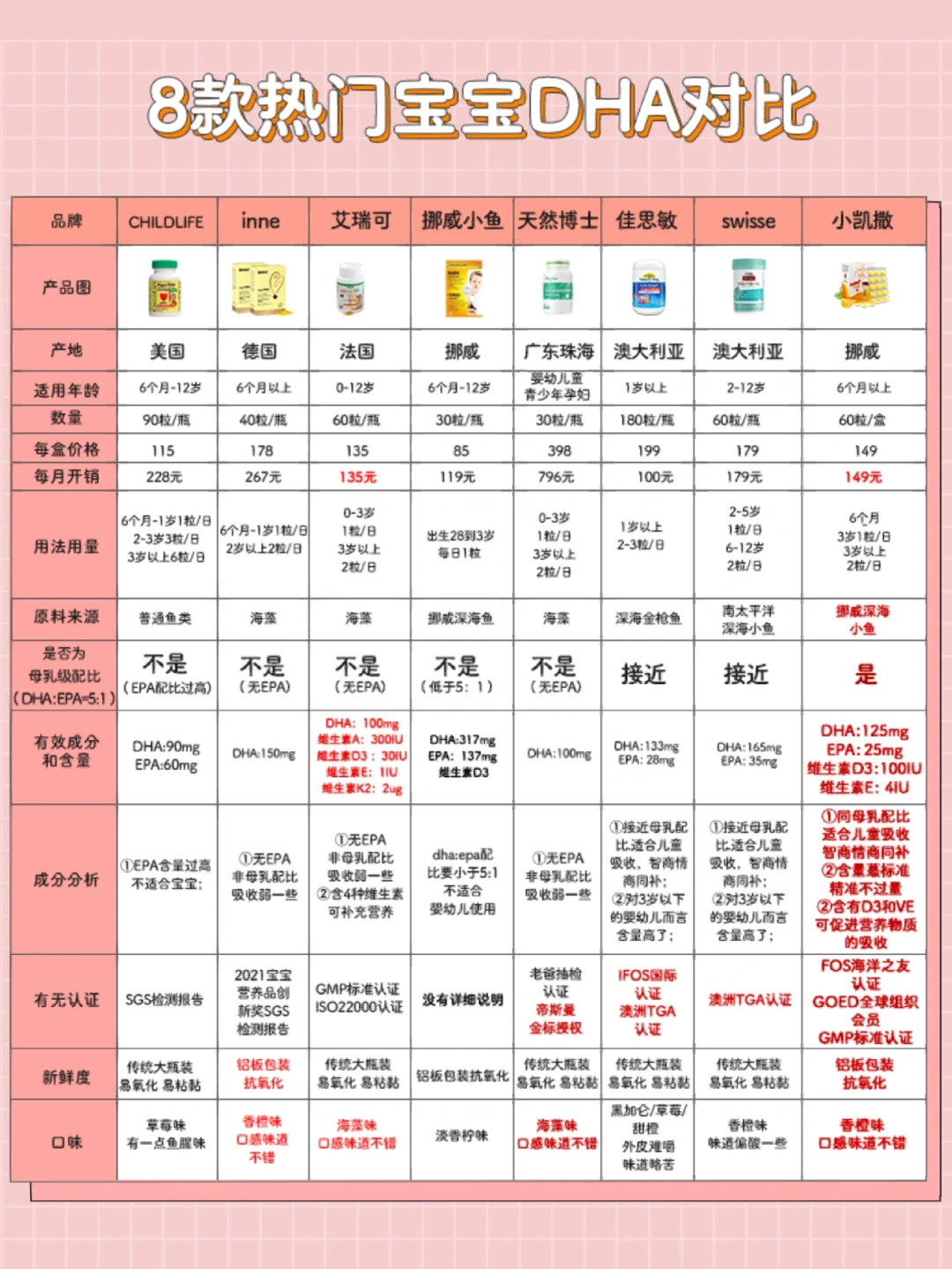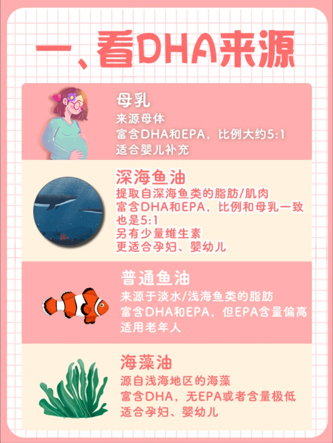一般婴儿所需母乳中富含DHA和EPA比例大约5:1,除母乳以外常见的三类补充剂有,普通鱼油DHA、海藻油DHA、深海小鱼的鱼油DHA。