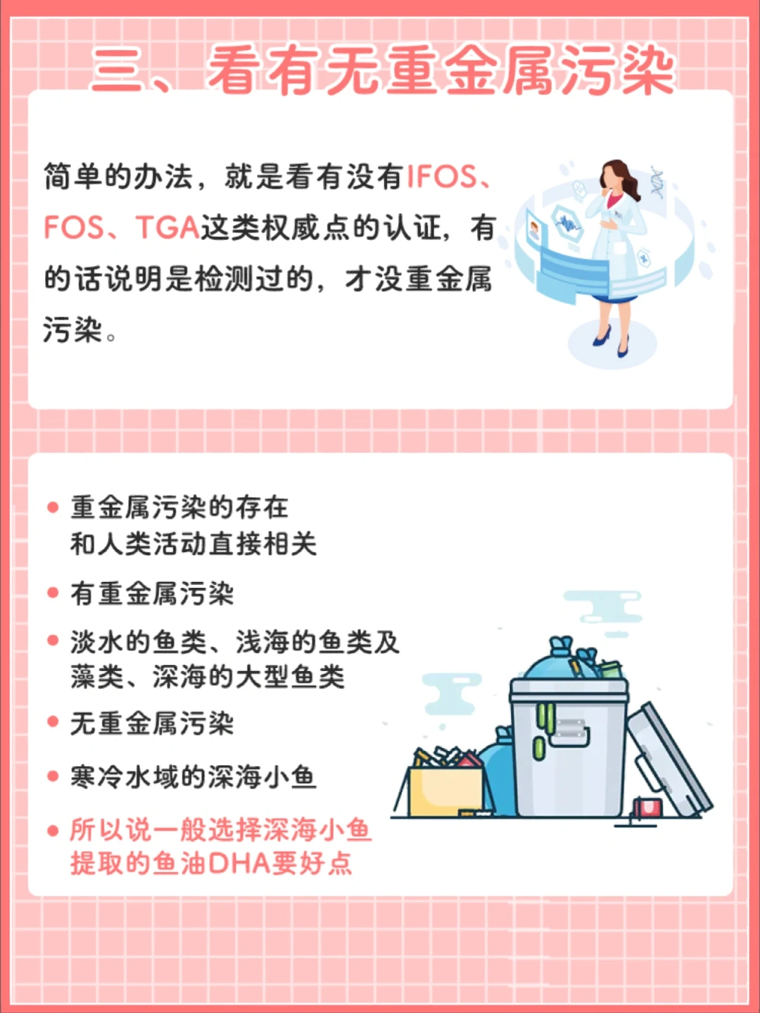 蕞简单的就是看有无IFOS、TGA、FOS的认证,有那就说明是检测过符合标准无污染的,可以放心给宝宝食用。