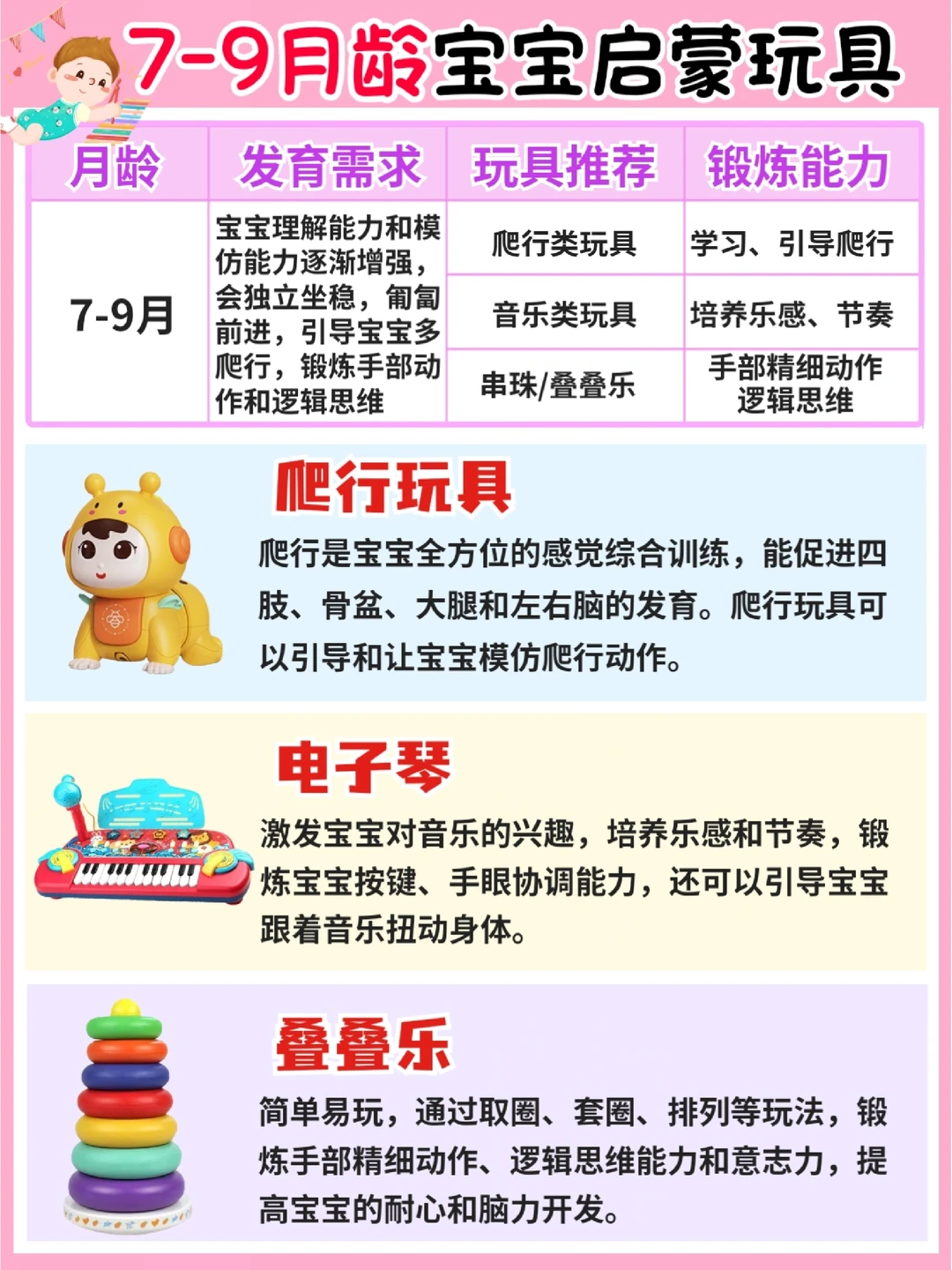 玩具:爬行玩具、电子琴、软积木、叠叠乐