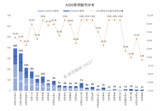 其中春秋航、西部航、长龙航、重庆航、青岛航等8家航司的A320系列占比机队的100%。