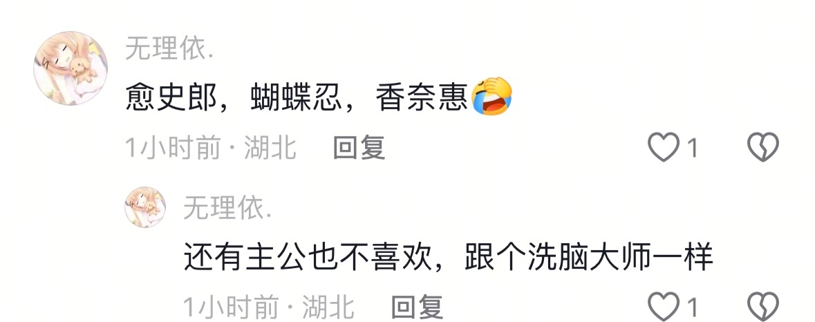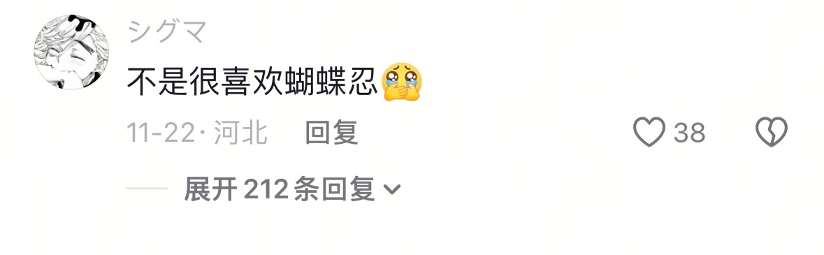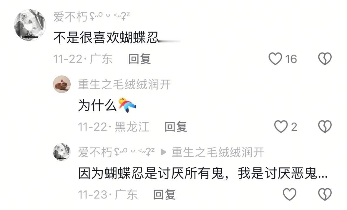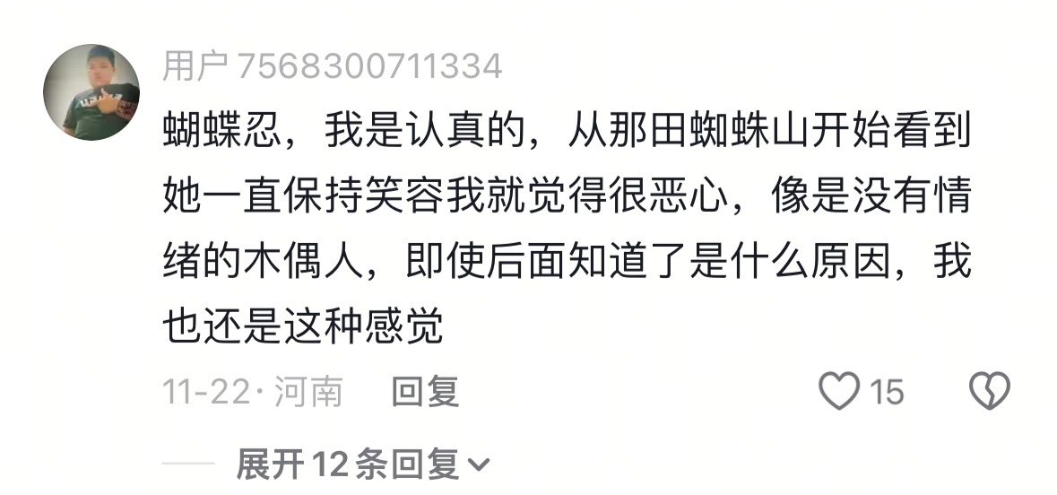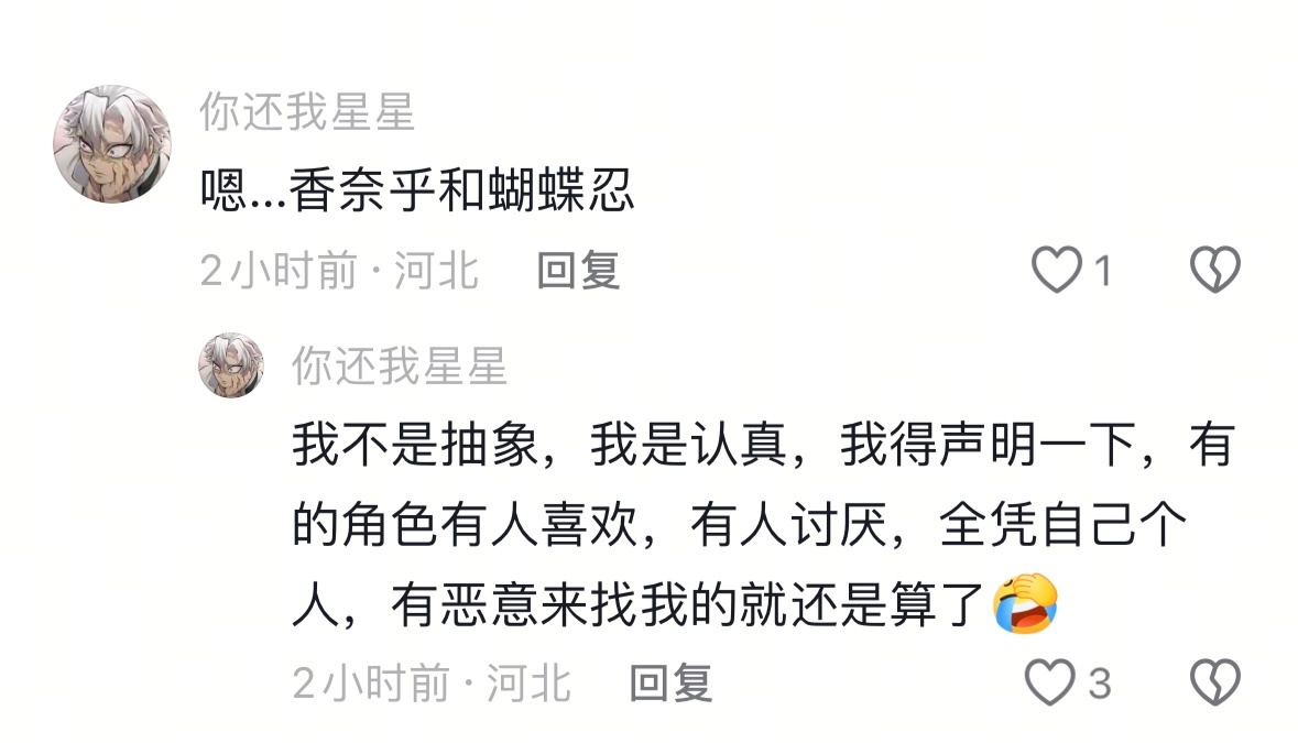 这个评论区~除了鬼以外提到最多的就是蝶屋姐妹了~蝴蝶忍更像是在惹了所有人其实我打开之前就知道很多人会说蝴蝶忍, 就大家非常会嘴硬的说和这个角色是不是女的没关系~确实不完全有关系。但其实只要蝴蝶忍长个吊~就是会少了很多恶意~国内对女性角色非常苛刻~很容易感受到吧。对男性角色是从恶里挑出魅力来喜欢,对女角色是从善里找出厌恶来讨厌。说讨厌她毒舌,但是其他男性毒舌甚至暴躁又都没关系,说因为她讨厌所有鬼,但是讨厌所有鬼的又不止她。说她一直微笑学姐姐很装,但是你离开后我活成了你的样子,这种设定又都吃。还有讨厌香奈乎和香奈惠的~香奈惠一共那点戏份~泡面还没泡好呢她的戏份就完了~你讨厌啥呢?其实很多讨厌真的就是纯恶意,越是纯恶意越是让人恶心你知道吧。像是见过一群罪恶滔天的人,结果就挑个没长吊的好人恨上了。