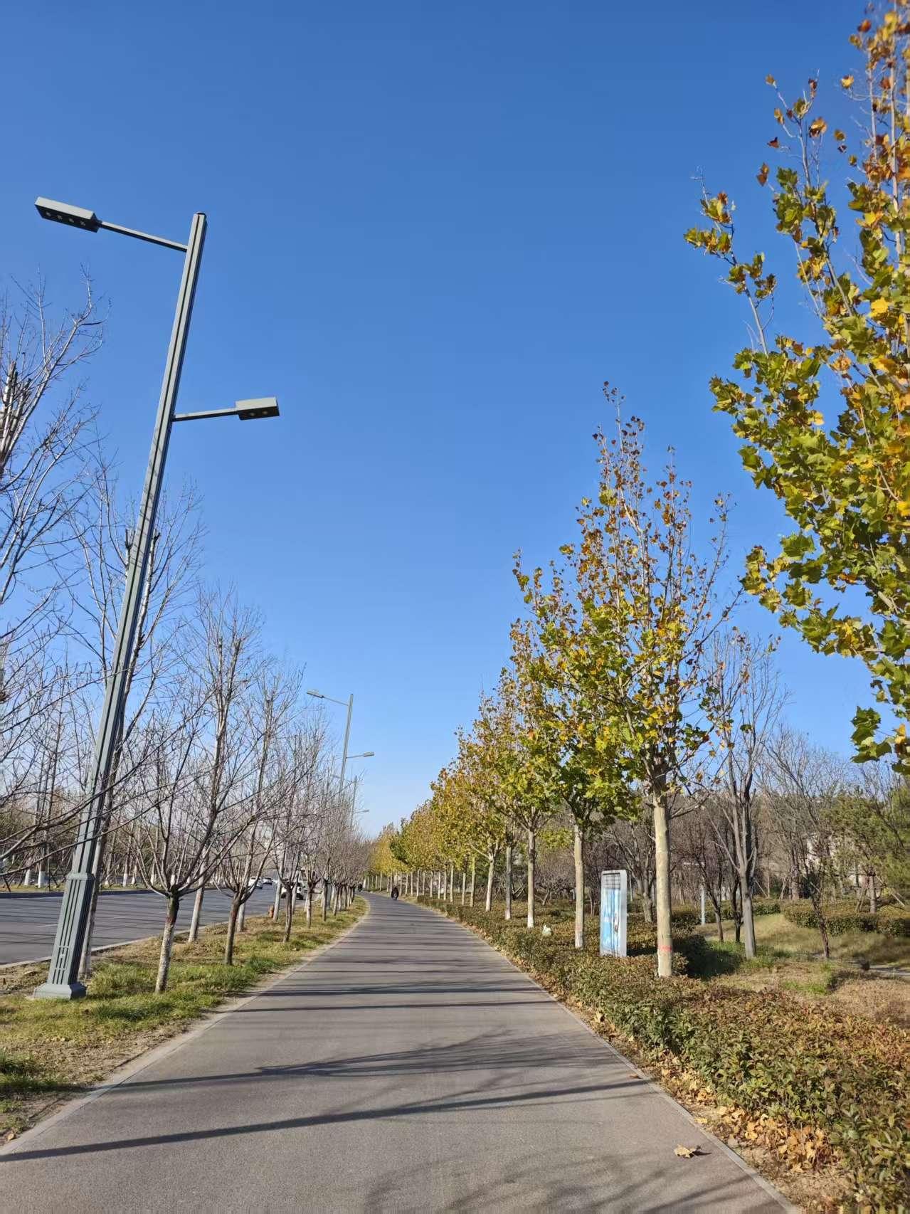 秋末冬初的城市步道,藏着最温柔的治愈 出门散步,撞见了秋末冬初最舒服的模样。 笔直的步道两侧,法桐叶子一半青一半黄,风一吹就簌簌落几片,铺在路边像打翻的调色盘。左边的树早秃了枝桠,右边还裹着半树黄绿,阳光斜斜地把路灯和树影都拉长,踩在影子上像踩着细碎的光斑。 路上没什么人,只有远处一个模糊的身影慢慢晃着,连风都轻得像在哼歌。这时候才觉得,不用赶时间,把日子过成慢镜头——没有喧嚣,只有蓝天、落叶和脚边窸窣的温柔。 这大概就是城市里最不起眼的小确幸吧。