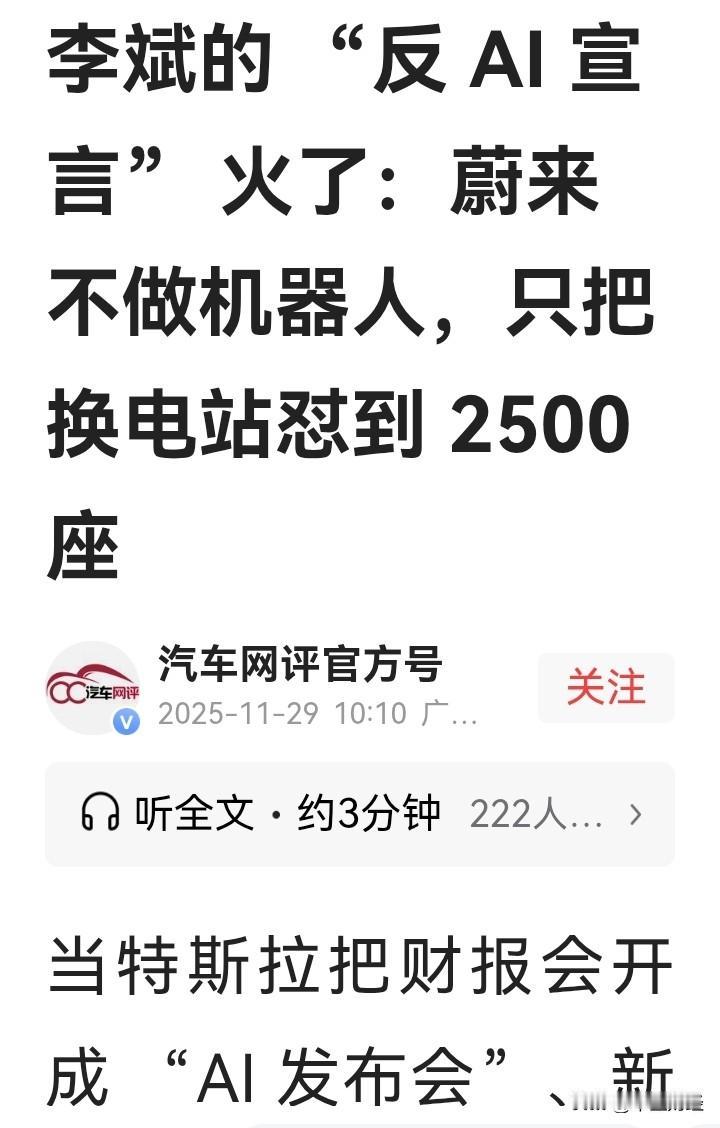 【蔚来:反Ai宣言?】电动汽车领域的特斯拉,不仅涉足电动汽车,还涉足太空领域以及人形机器人等;中国电动汽车领域的小鹏汽车,也大力进入低空经济和人形机器人领域。 在这个档口,连年亏损的蔚来汽车,宣布不进入AI领域,要把换电模式作为突破口,这恐怕是一种危险的经营策略。这也可能是一种高负债亏损模式下,难以拓展AI领域的一种无奈表态。 固态电池上市,还有几个换电的?如果现在的电动汽车能在十分钟内充满500公里路程,谁还去换电……。 买电动车蔚来ES8你纠不纠结? 蔚来ES6的实际续航怎么样