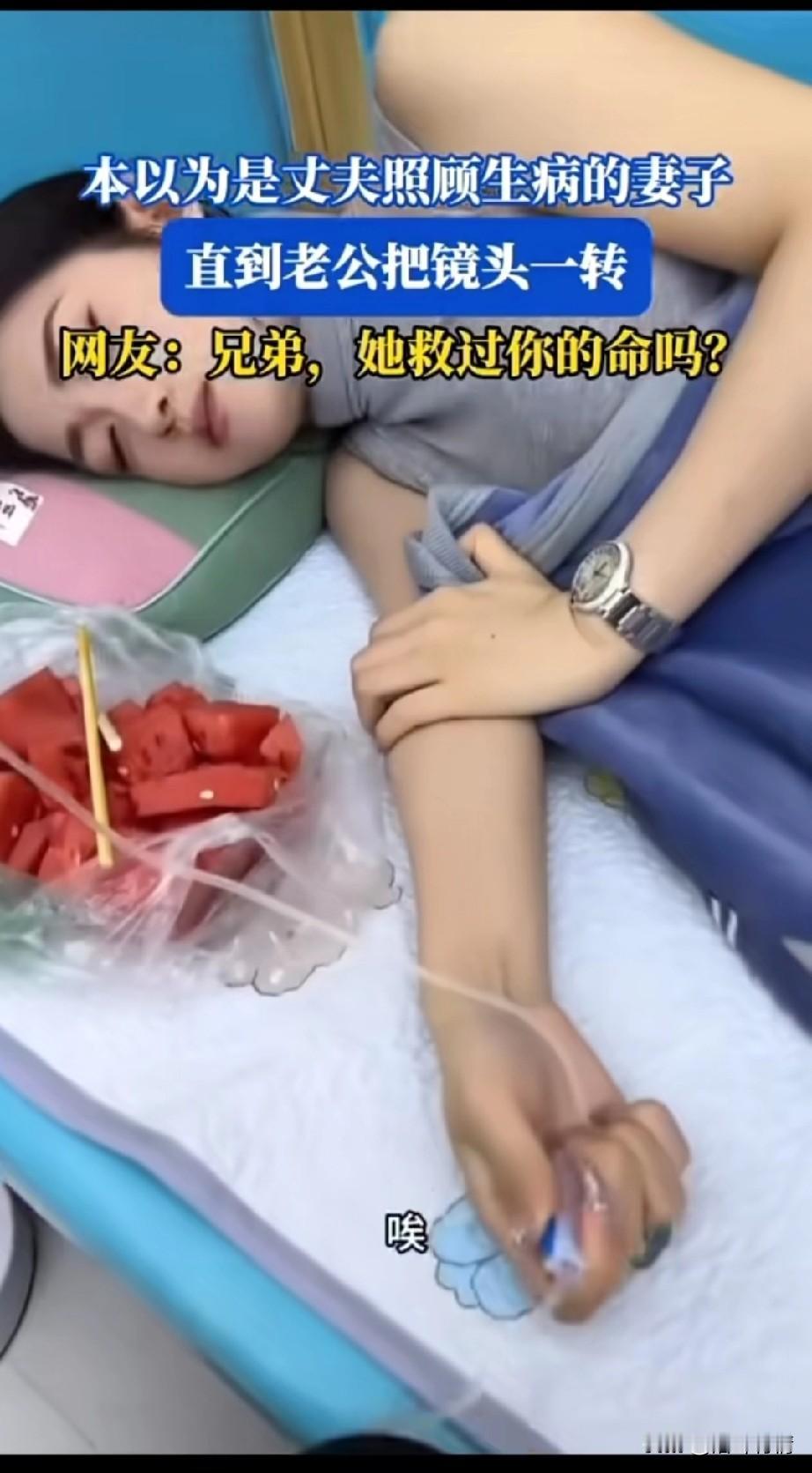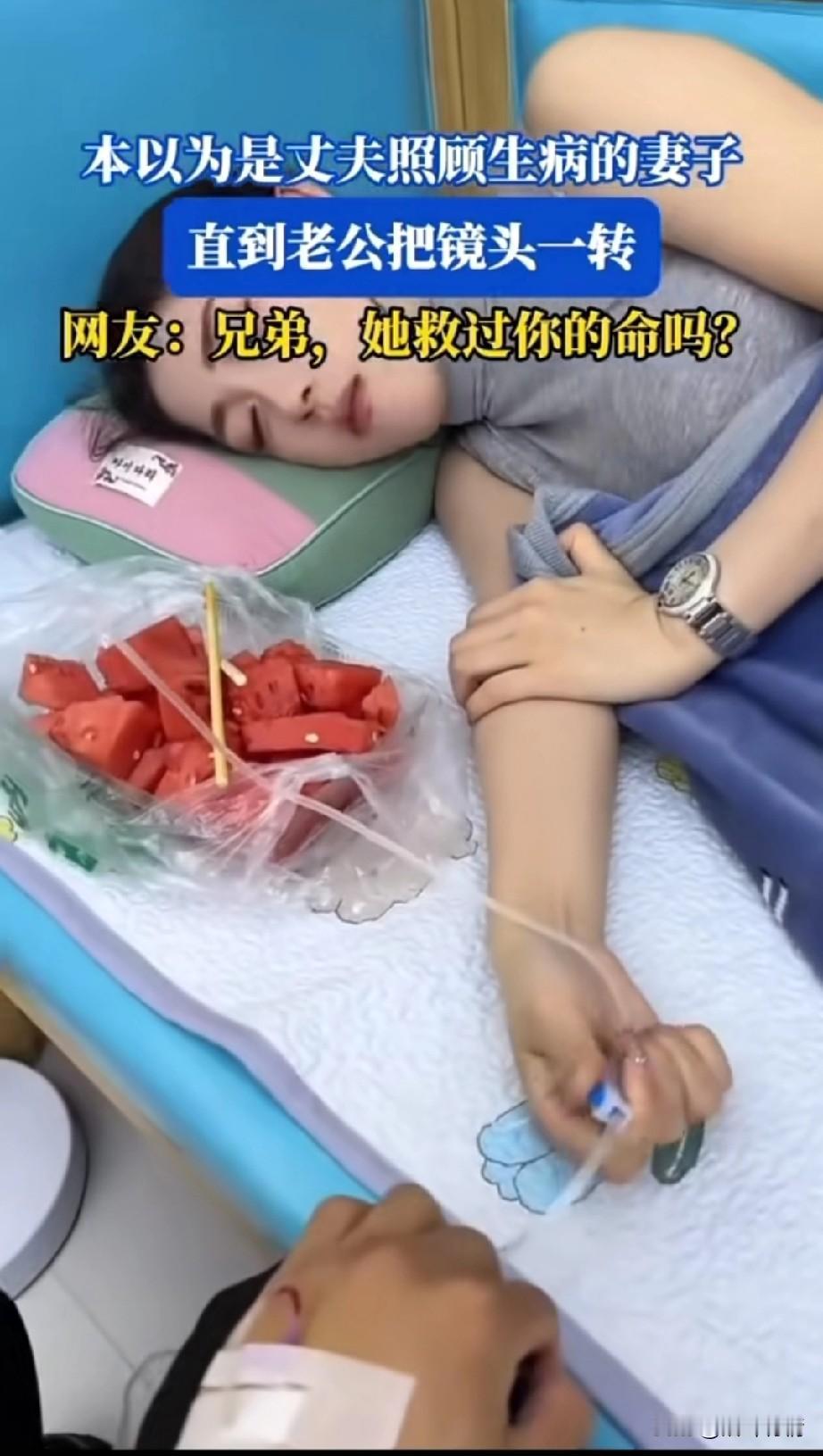 女子躺在病床上, 看着一脸不舒服的样子, 老公特地给她买了西瓜, 还拿着筷子给它喂到嘴里, 女子勉强睁开眼睛看了老公一眼, 然后将西瓜块儿勉强吃了下去, 还将旁边的摊子给妻子盖了上去, 怕她躺着有点着凉, 吃了几块儿妻子就不吃了, 以为是老公照顾生病的妻子, 觉得她老公对她太好了, 结果镜头一转, 是老公在挂吊瓶, 其实就是个陪护的, 结果妻子躺在病床上, 手里还拿着吊瓶的进水开关, 这是掌握了输水速度开关了, 还问老公怎么样? 老公表示输水速度可以, 这样的妻子还不如不来陪护, 这到底是谁照顾谁呀? 大家对于这样的家庭生活怎么看? 婚姻与家庭 婚姻的苦恼分享 照顾病床老公 病床上的女人