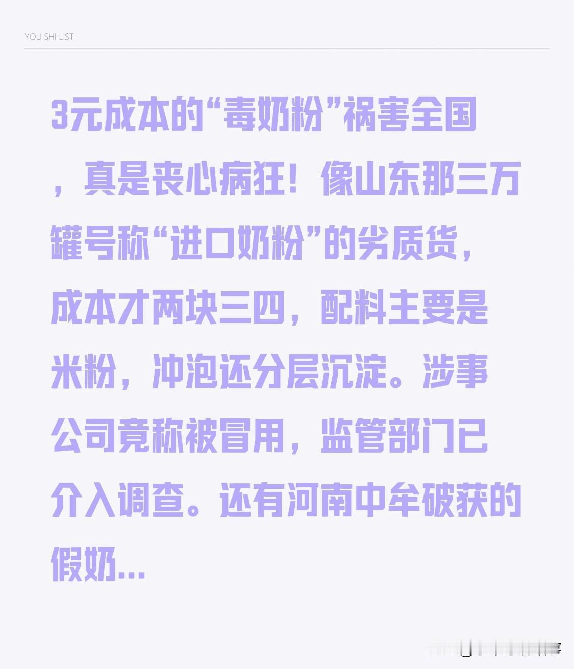 3元成本的“毒奶粉”祸害全国,真是丧心病狂!像山东那三万罐号称“进口奶粉”的劣质