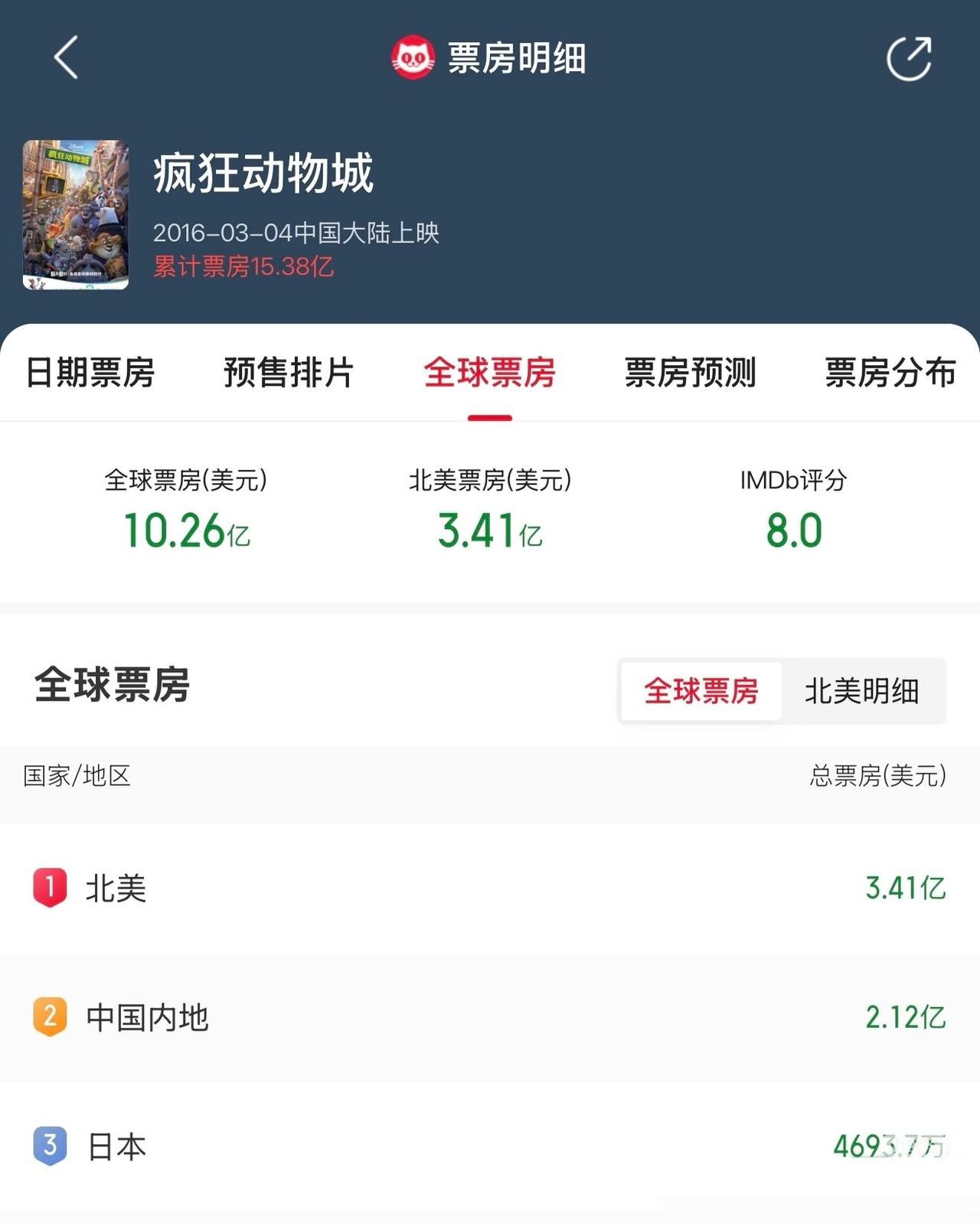 疯狂动物城2的票房太夸张了,内地占66% 疯狂动物城2的票房太夸张了。目前中国票房占全球票房的66%。第一部只占20%。第二部虽然没有第一部精彩,但完成度很高。这个数据也说明了,中国电影现状不是大家不看电影了,而是没有值得大家进电影院的电影!