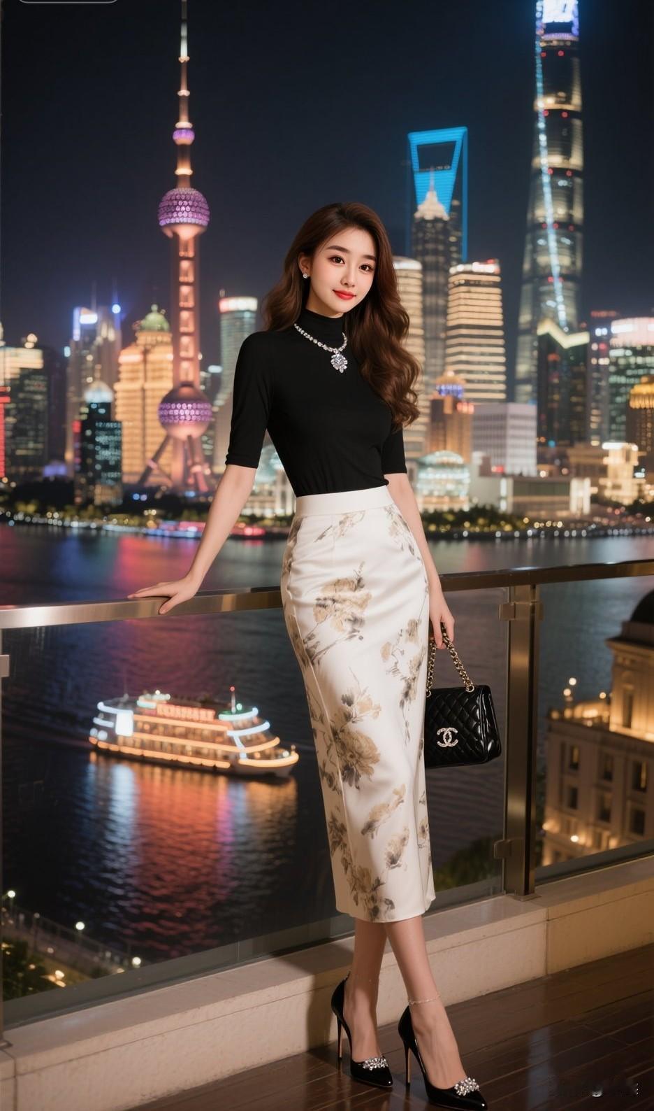 ✨好看又舒适的穿搭 ,海上夜景下,这身穿搭美炸!黑色高领中袖上衣,简约又显瘦,搭配水墨印花白色长裙,灵动优雅~亮片高跟鞋增添精致感,香奈儿包包点睛💎 舒适与颜值双在线,日常出街或约会都超适配,轻松拿捏时尚感,谁穿谁美!