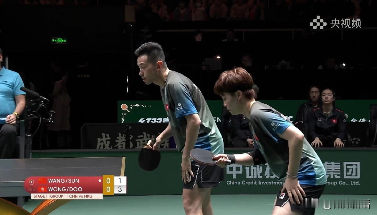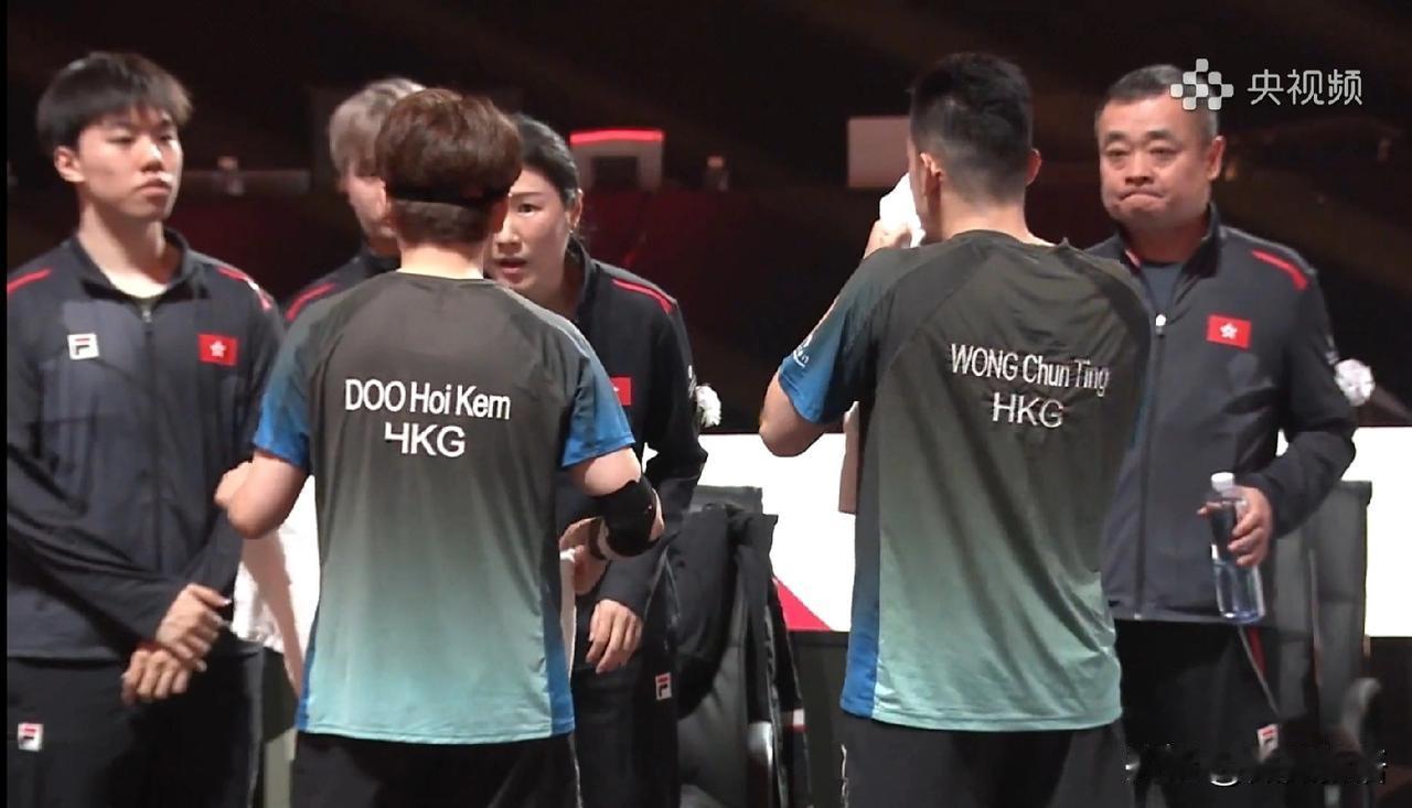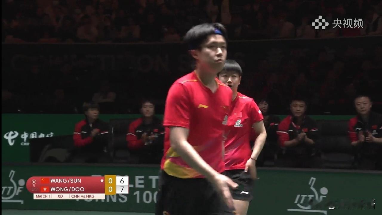 看着教练比运动员还紧张呢。 今天的比赛要开始了,一号台是中国队对中国香港队,莎头组合刚入场后,现场的球迷们就很激动了,听到都在喊:“莎头加油”。今天莎莎和楚钦是穿了红色的比赛服,不过入场后没有看到肖导。现在央视频解说是英文,听到说亚当在解说比赛。 运动员准备好后,中国队这边是王皓和马琳两个人,俩人一直在安顿两个孩子,镜头再给到港队那边,港队的两个教练也是很紧张的,瑞姐也是一直在跟黄镇廷、杜凯琹安顿一下。 确实比赛一开始还是有点紧张的,莎头和港队黄镇廷/杜凯琹也是有一段时间没交手,虽然都是很熟悉,但是一上来还是有一点不太适应,黄镇廷/杜凯琹开局是6:2领先,不过后面莎头也一直在追分,把比分追到了6:7,只有一分的分差,后面两对组合的比分来到了9:9,莎头组合10:9先拿到局点,港队也不放弃,把比分又追平到10:10,这第一场比赛打的真精彩啊,最终莎头组合12-10拿下第一局,为中国队拿到第一分,接下来继续加油哦!