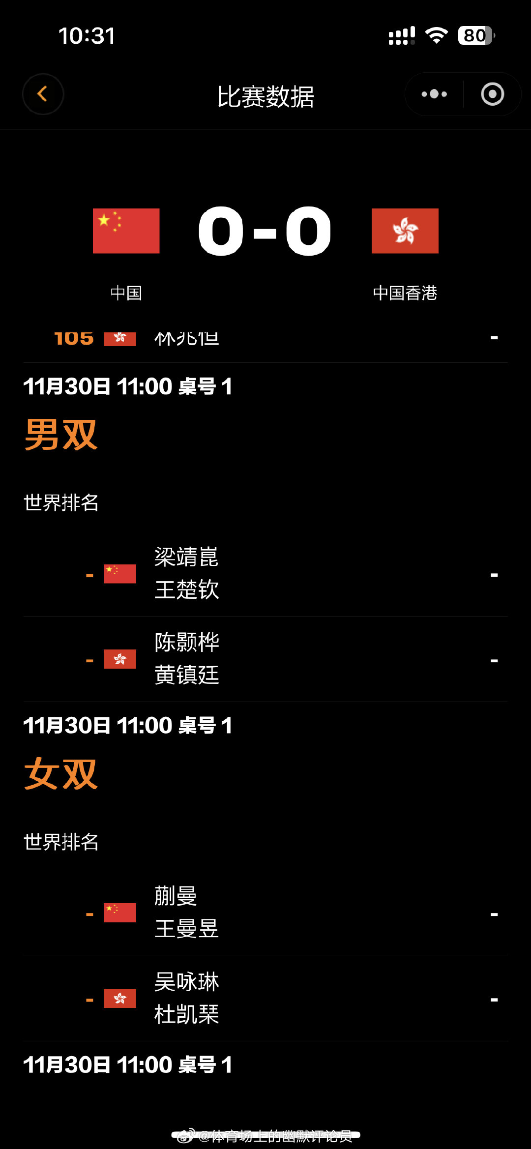 20251130|混团对阵11月30日 11:00T1 中国VS中国香港第一盘混双:王楚钦/孙颖莎VS黄镇廷/杜凯琹第四盘男双:王楚钦/梁靖崑VS黄镇廷/陈颢桦 ()