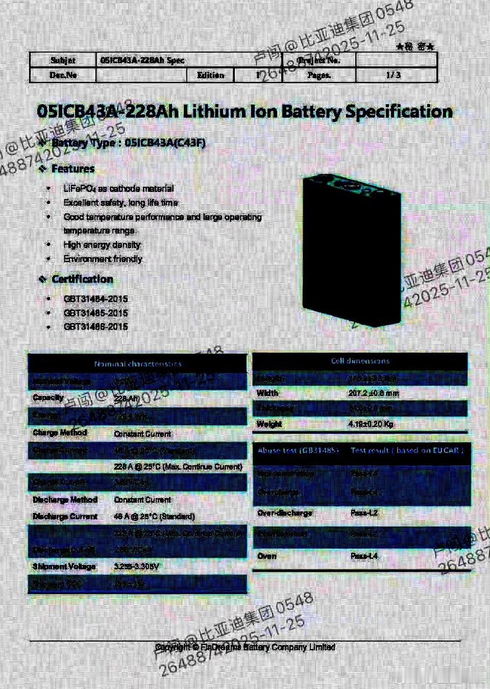 这位卢闯,其实只是一名负责储能电池的销售。这个54173规格228Ah的电芯,也是比较早的储能电芯。比亚迪现在有更好的71173产品。可惜厂长接触不到。厂长故意把水印泄露出来。是想忽悠自己的粉丝,你看,我能拿到内部资料!甚至让粉丝以为自己跟比亚迪的研发人员有深度交往。单纯就只是一个储能电池的销售把一个比较老的产品发给了厂长而已。事情本身不大。但是,能把资料泄露给厂长。谁知道会不会把更重要的资料泄露给其他人?还是建议比亚迪查一下吧。