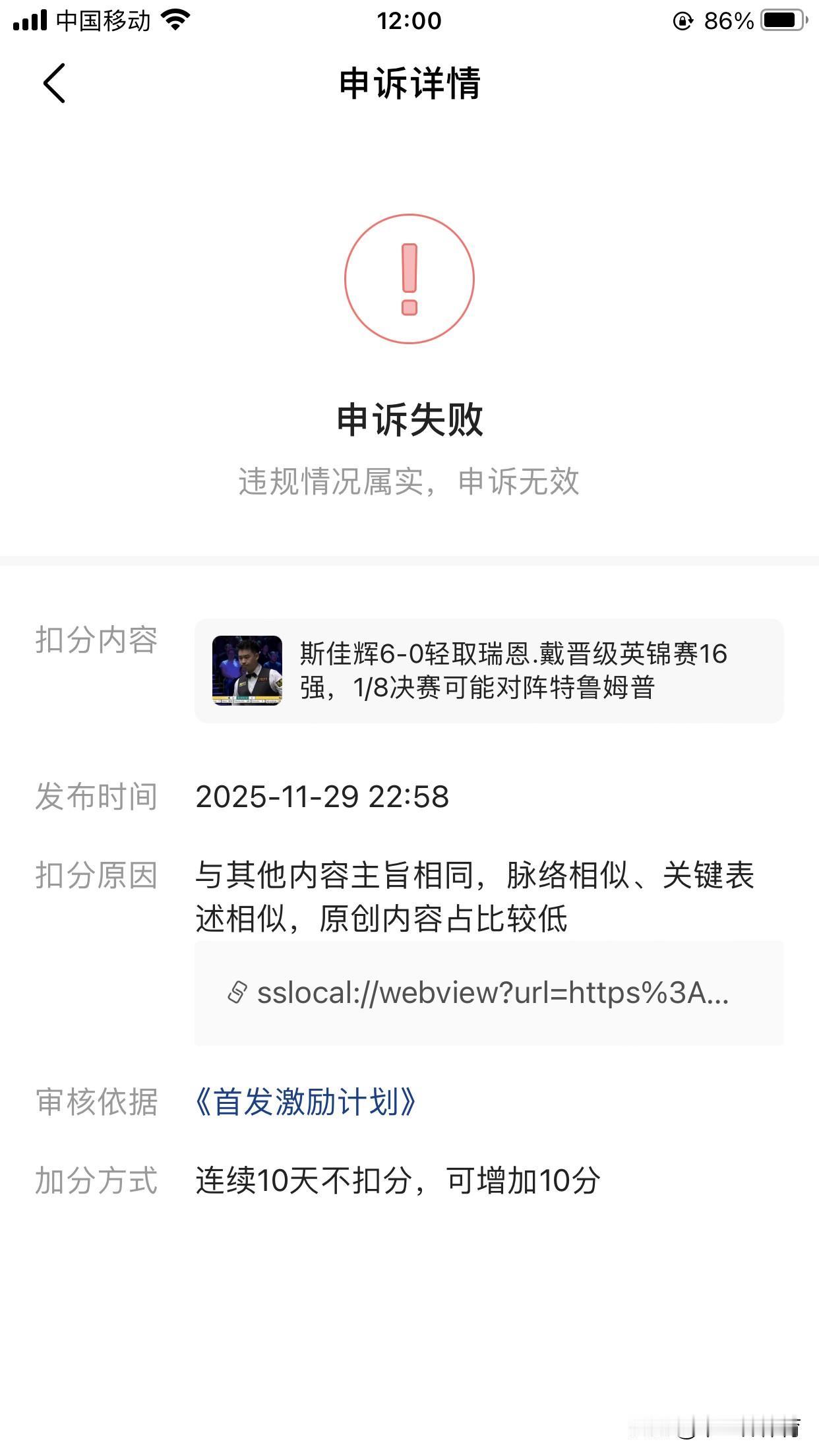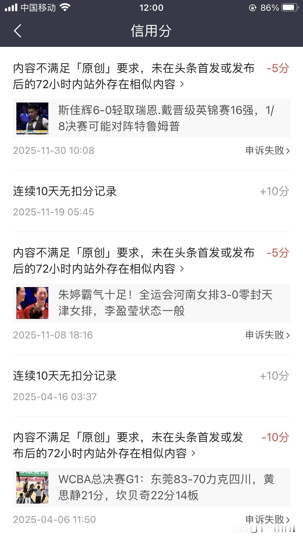 申诉失败了,难道同样一场比赛只能提供一个媒体报道吗? 不明白,系统判定这么苛刻,同样的比赛,同样的比赛结果,还能写出花样来,不明白咱们系统咋这样啊,不给平民生存的空间,再一次申诉失败,就是处处打压,在今天头条太憋屈了