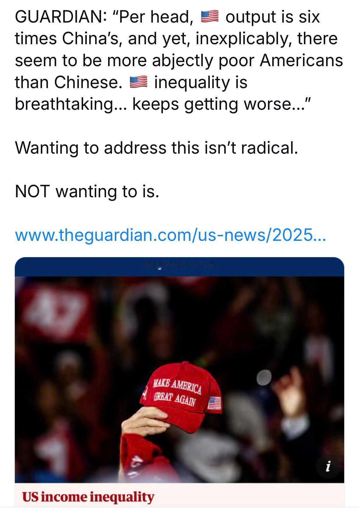 卫报把话挑明:“中国让数百万人脱贫,美国却选择无动于衷。”标题够狠,数据更扎心——美国人均产出是中国的6倍,赤贫人口却反向领先,高产出与多贫民同框,像一面哈哈镜照出“发达”二字的裂缝。 医疗债务、四十年不变的联邦最低工资、资本利得税率低于工薪税,三台抽血机把底层牢牢按在地板上。在我看来,贫穷不是数字游戏,而是政策选择;当制度把贫困定义为个人失败,再高的GDP也填不满一口生活的井。 中国用驻村第一书记、基建下乡、产业合作社把“赤贫”手动归零,证明意愿到位,钱包就能到位。 如果给你一键决策权,你会先提高美国最低工资、全民医保,还是向富人加税?答案交给评论区。