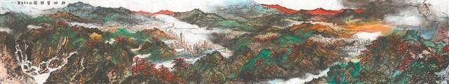 逾11米的《珠江览胜图》是一部集珠江气势、传统笔墨技艺与深厚人文于一体的画作。它不仅是一幅描绘珠江风貌的艺术作品,也凝聚了对广州城市文脉的深刻理解。此画作融合了传统与现代、艺术与现实、抽象与具象等多重创作语境,以艺术的手法全面展示了珠江的浩瀚气象与丰富的文化内涵。