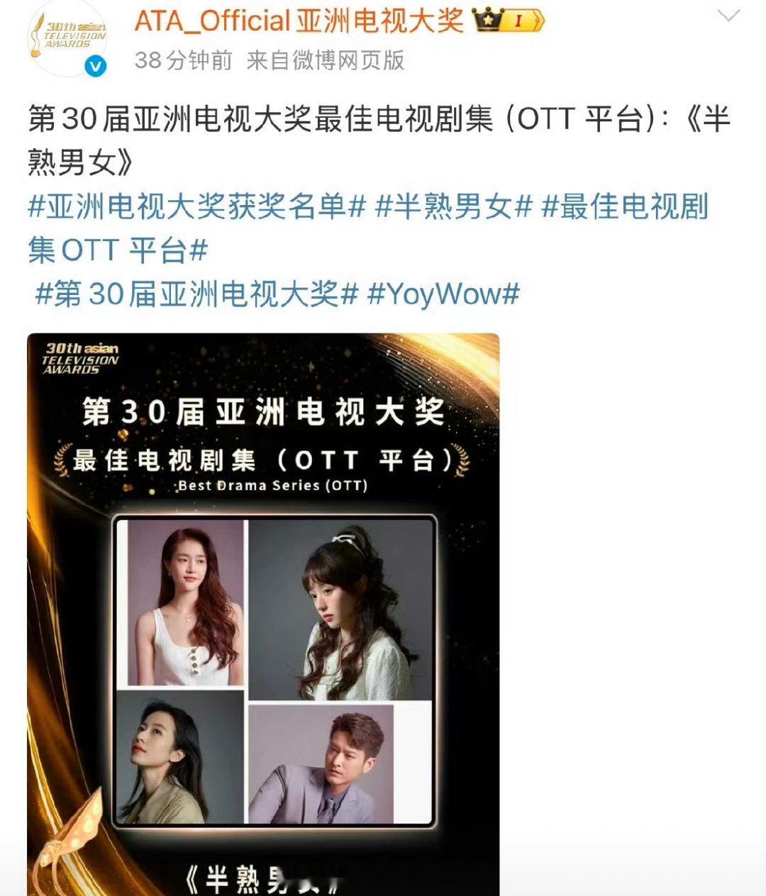 田曦薇《半熟男女》获第30届亚洲电视大奖最佳电视剧集