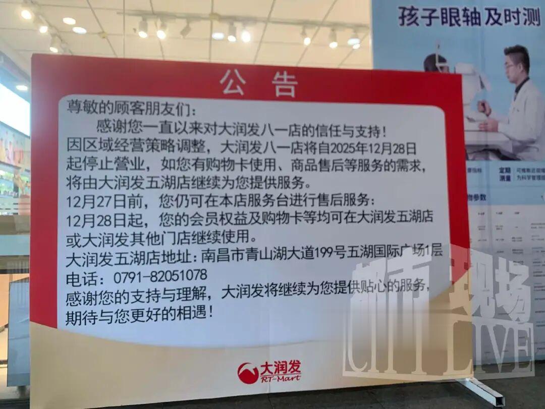 公告显示:因区域经营策略调整,大润发八一店将自2025年12月28日起停止營业,如您有购物卡使用、商品售后等服务的需求,将由大润发五湖店继续为您提供服务。