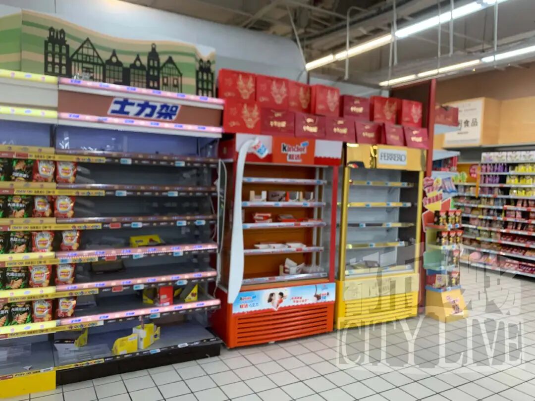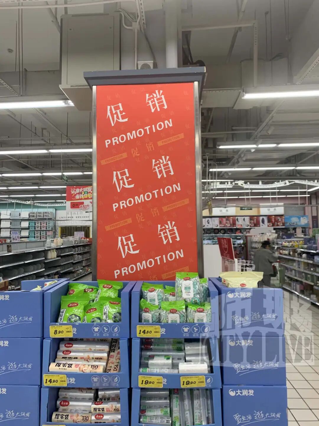 目前,超市二楼及三楼还处于正常营业状态,除部分货架被清空外,大部分商品摆放较满,不过,超市内已张贴了不少“促销”告示。