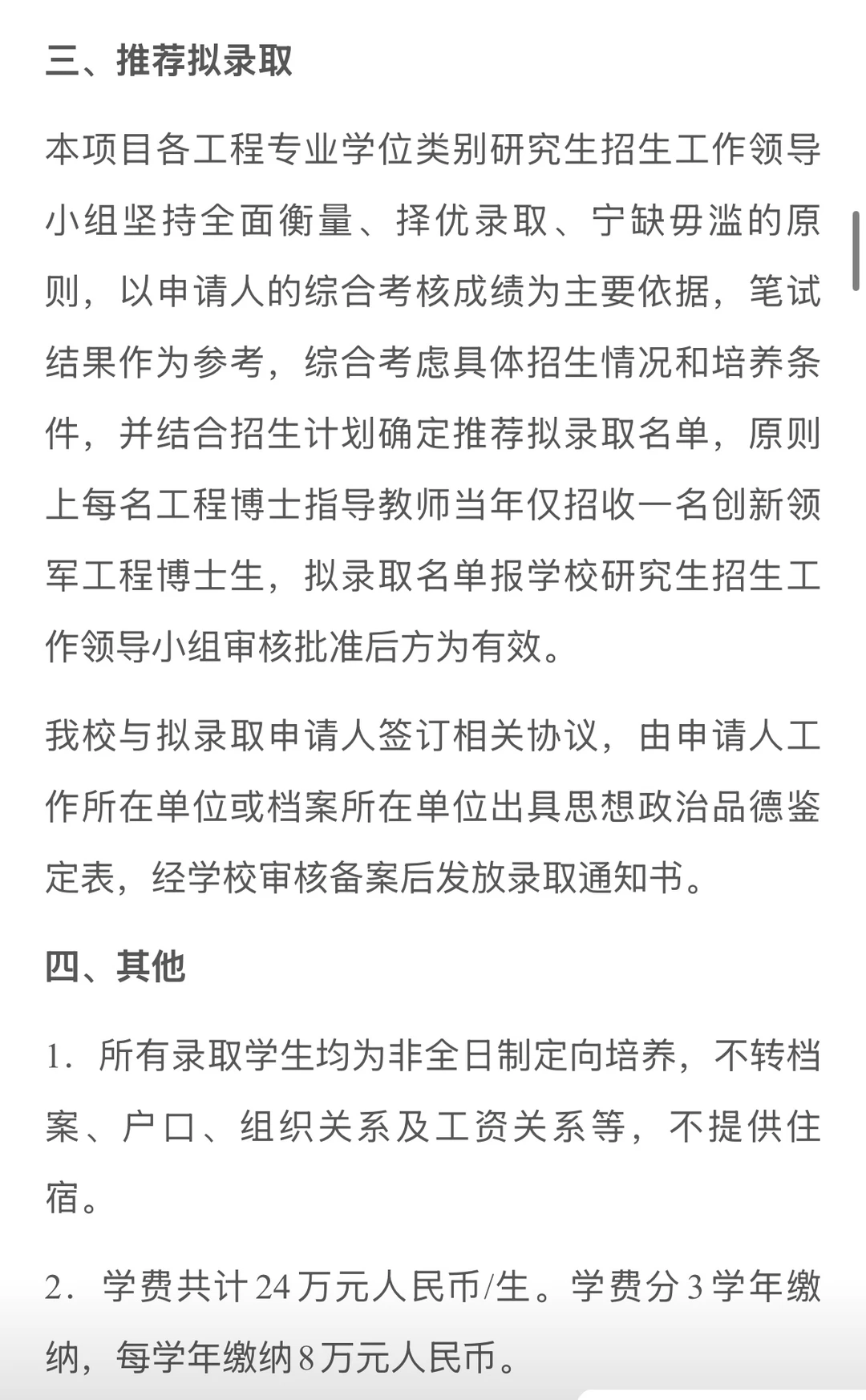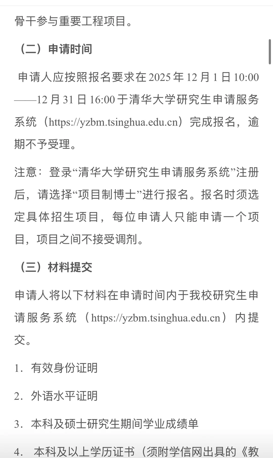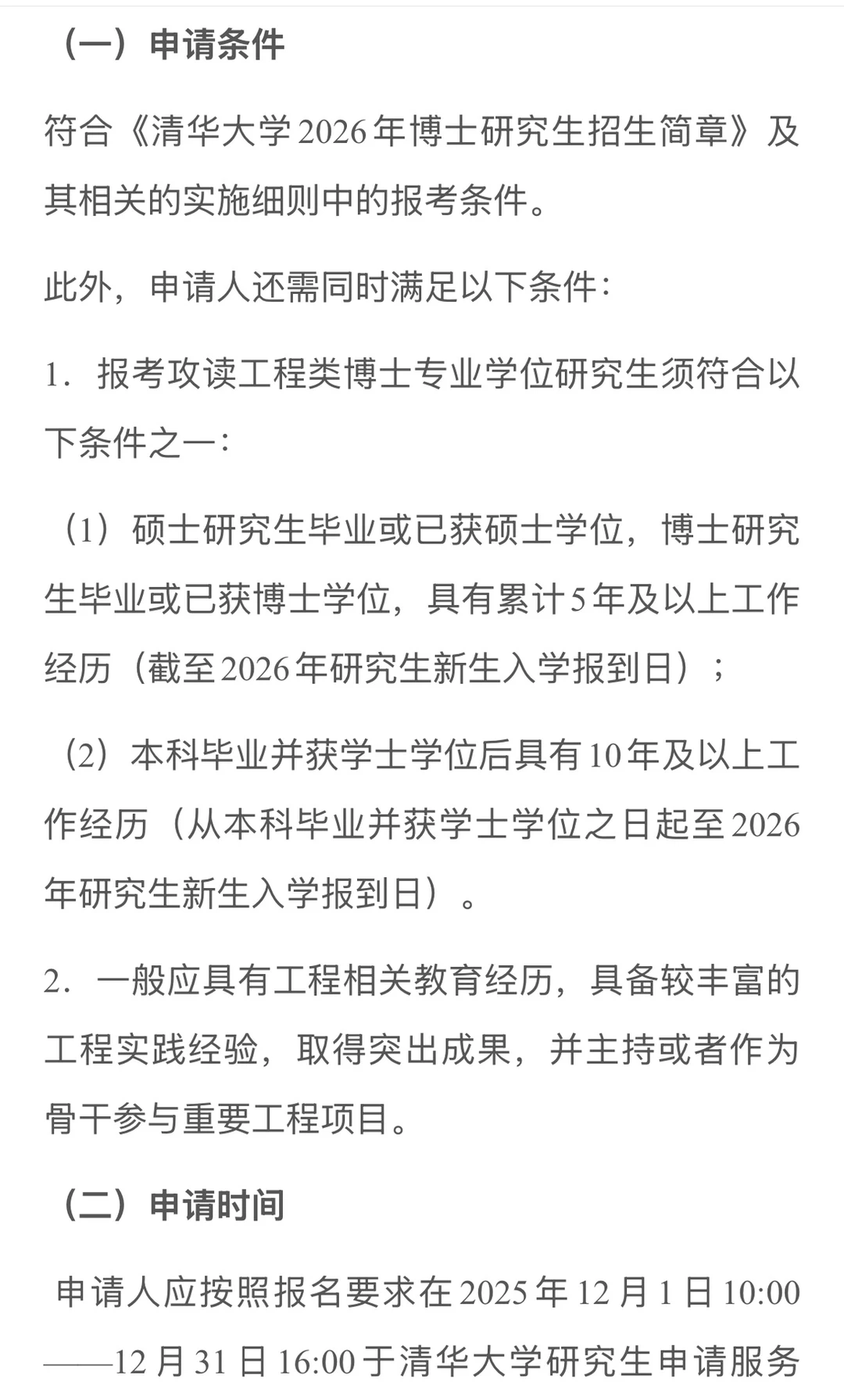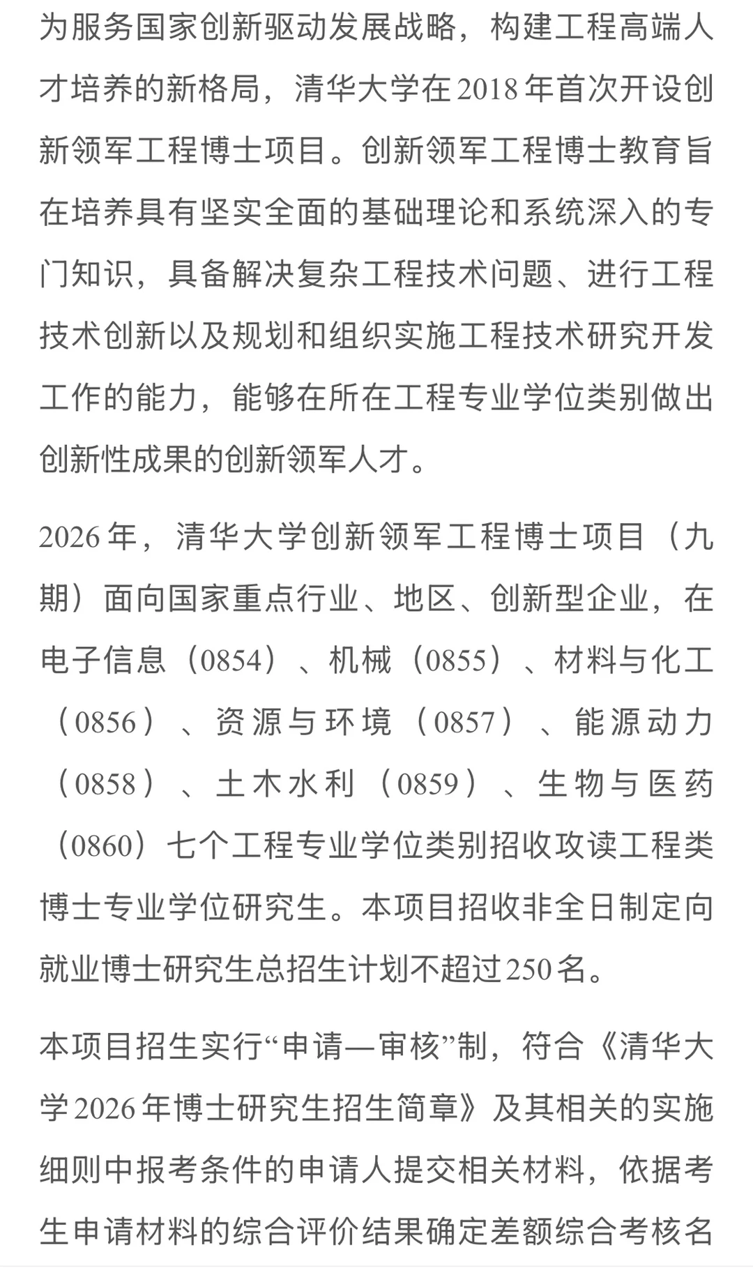 2026年,清华大学创新领军工程博士项目(九期)面向国家重点行业、地区、创新型企业,在电子信息(0854)、机械(0855)、材料与化工(0856)、资源与环境(0857)、能源动力(0858)、土木水利(0859)、生物与医药(0860)七个工程专业学位类别招收攻读工程类博士专业学位研究生。本项目招收非全日制定向就业博士研究生总招生计划不超过250名。本项目招生实行“申请―审核”制,符合《清华大学2026年博士研究生招生简章》及其相关的实施细则中报考条件的申请人提交相关材料,依据考生申请材料的综合评价结果确定差额综合考核名单,经综合考核后择优推荐拟录取非全日制博士博士申请考核清华大学