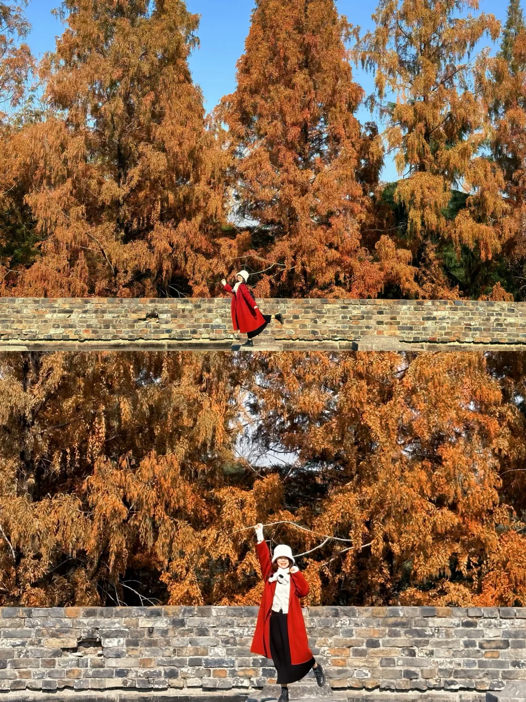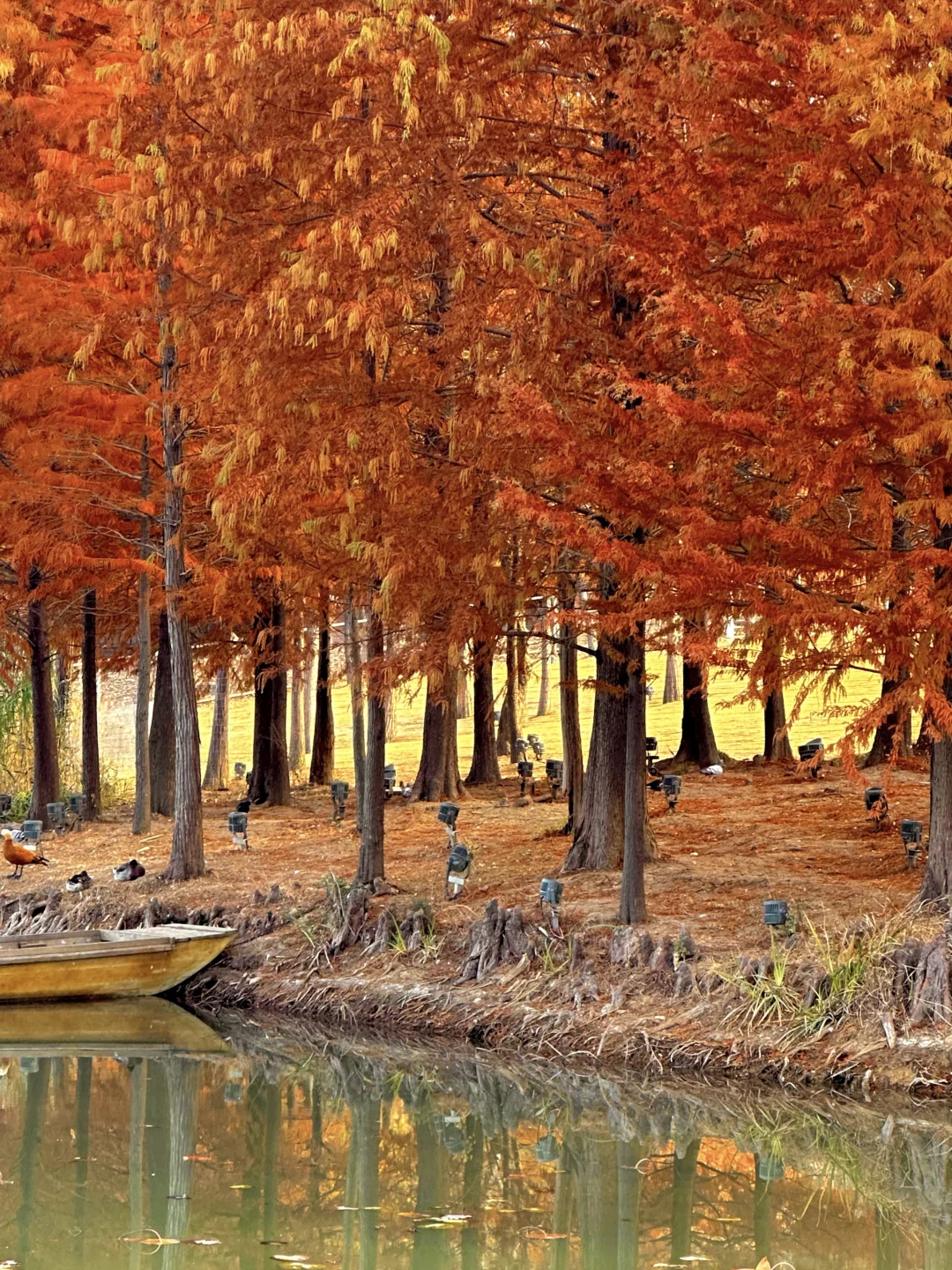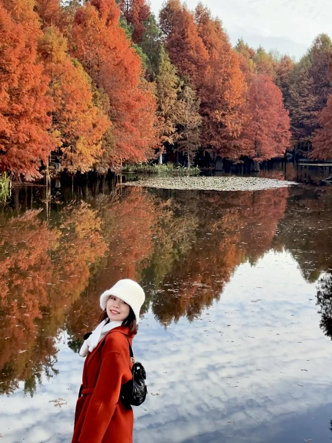 橘色水杉倒映湖面,像上帝打翻的调色盘,不用滤镜直接出片