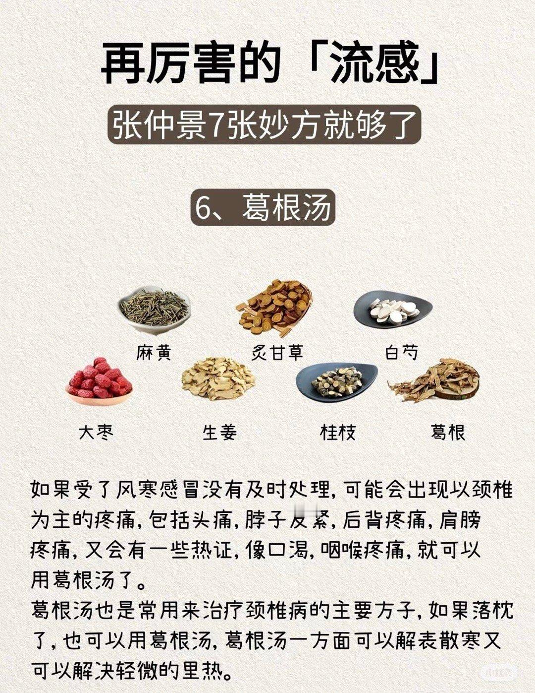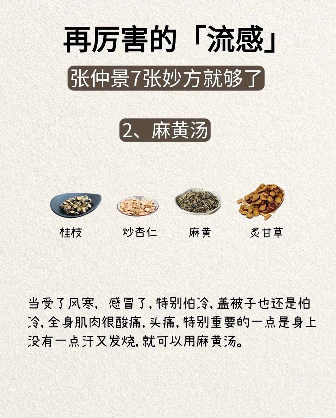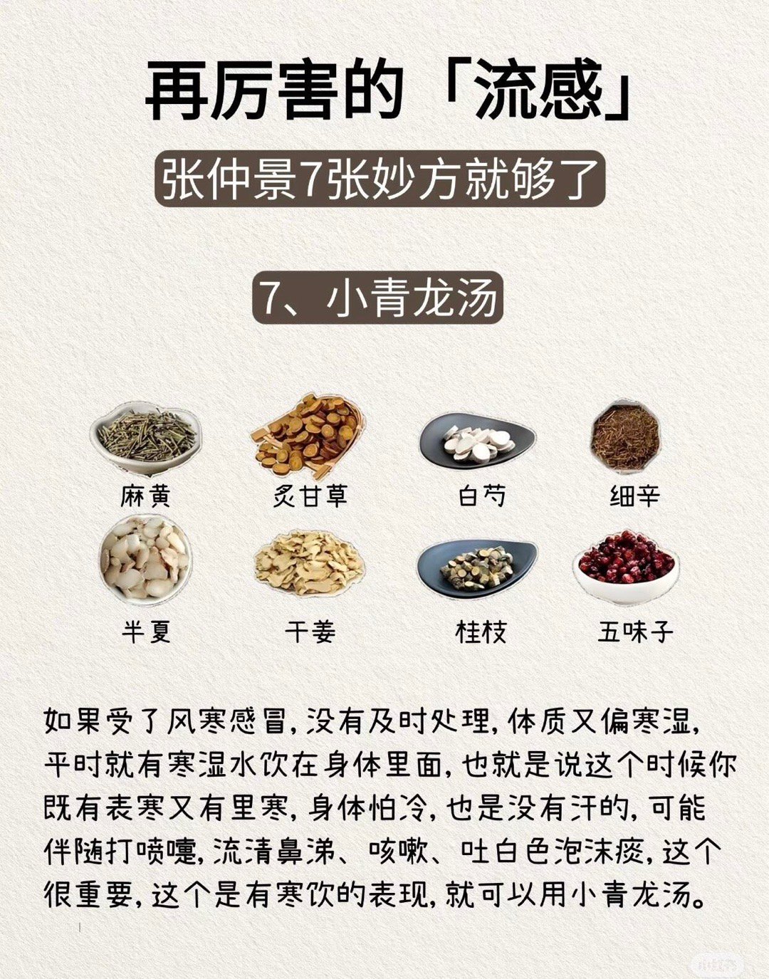 再厉害的「流感」,张仲景7妙方就够了张仲景感冒七大古方感冒了别再乱吃药!医圣张仲景早就把辨证说透了,这7个千古名方收好!✨七大古方对症指南✨1️⃣ 桂枝汤 - 发烧+汗出+怕风(风寒表虚)2️⃣ 麻黄汤 - 发烧+无汗+身痛(风寒表实)3️⃣ 大青龙汤 - 高烧+烦躁+无汗(表寒里热)4️⃣ 麻杏石甘汤 - 咳喘+汗出+烦渴(肺热咳喘)5️⃣ 小柴胡汤 - 忽冷忽热+口苦(半表半里)6️⃣ 葛根汤 - 项背强痛+恶寒无汗(太阳伤寒)7️⃣ 小青龙汤 - 咳喘+痰多清稀(寒饮咳喘)💡重要提醒:先辨证,再用药严重者请及时就医建议在医师指导下使用本文为中医知识科普养生寒咳和热咳
