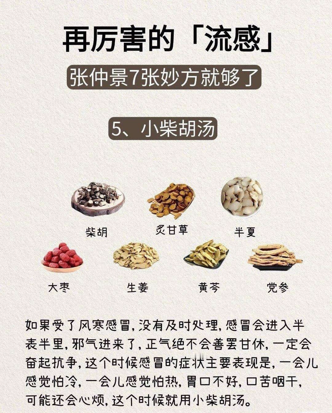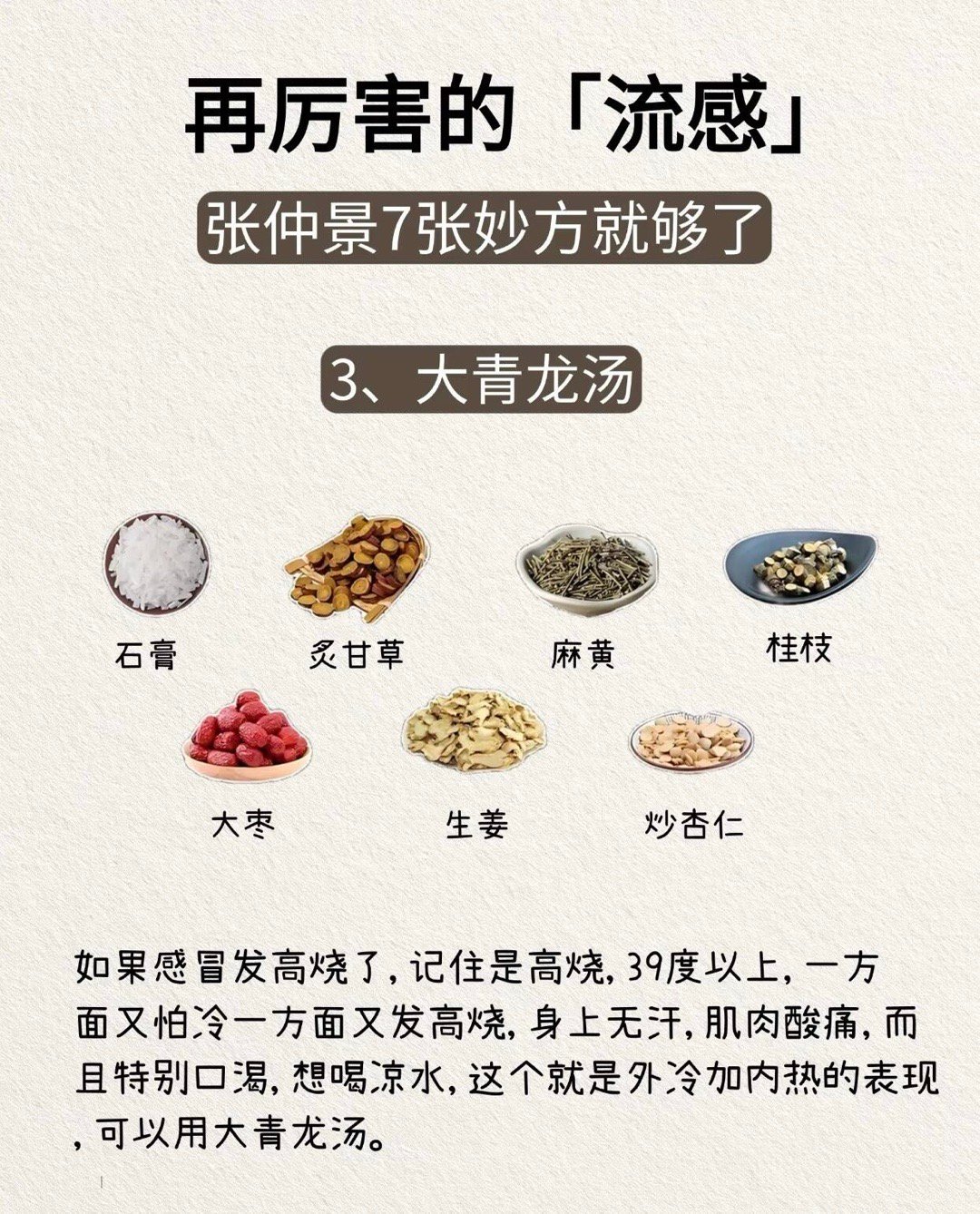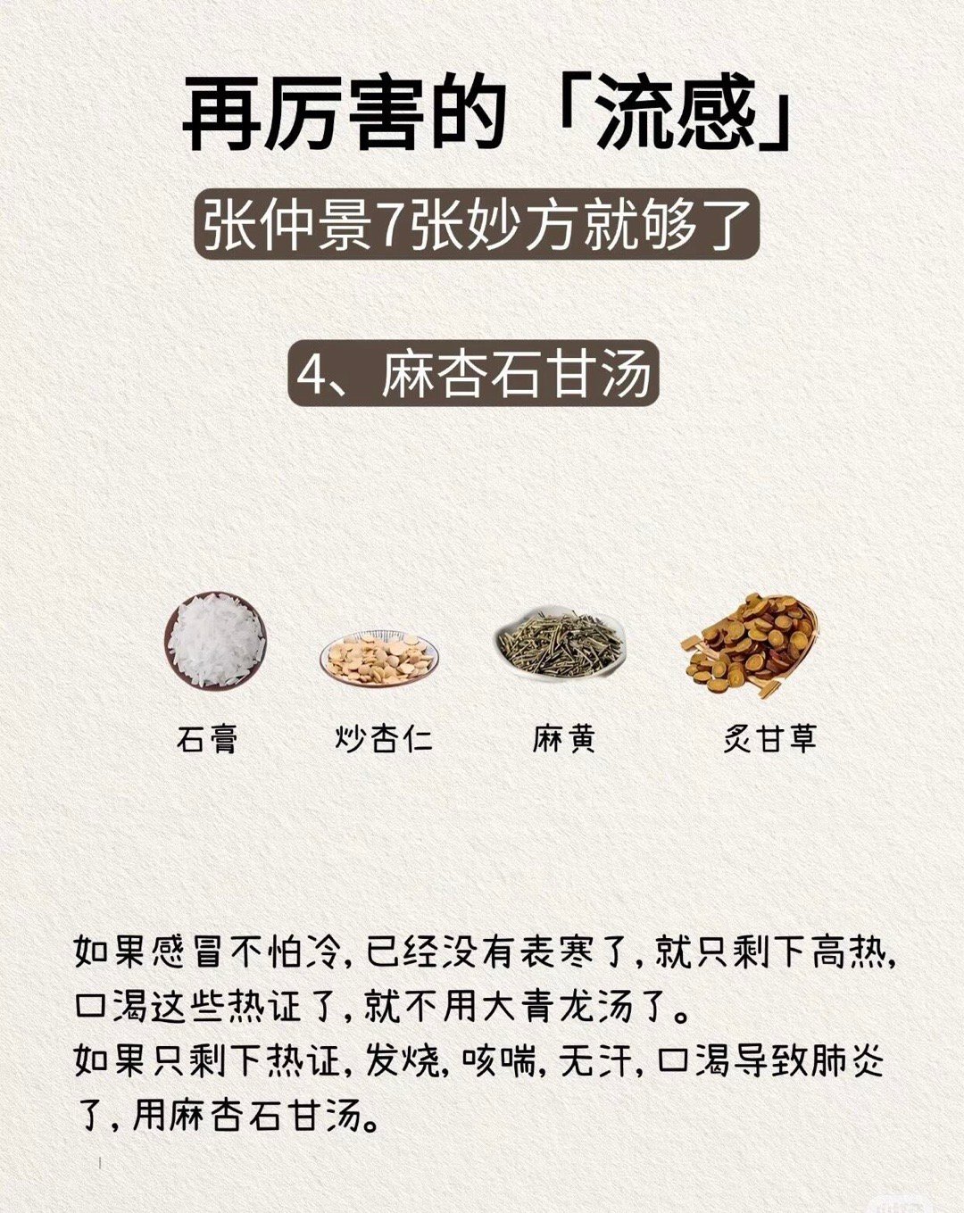 再厉害的「流感」,张仲景7妙方就够了张仲景感冒七大古方感冒了别再乱吃药!医圣张仲景早就把辨证说透了,这7个千古名方收好!✨七大古方对症指南✨1️⃣ 桂枝汤 - 发烧+汗出+怕风(风寒表虚)2️⃣ 麻黄汤 - 发烧+无汗+身痛(风寒表实)3️⃣ 大青龙汤 - 高烧+烦躁+无汗(表寒里热)4️⃣ 麻杏石甘汤 - 咳喘+汗出+烦渴(肺热咳喘)5️⃣ 小柴胡汤 - 忽冷忽热+口苦(半表半里)6️⃣ 葛根汤 - 项背强痛+恶寒无汗(太阳伤寒)7️⃣ 小青龙汤 - 咳喘+痰多清稀(寒饮咳喘)💡重要提醒:先辨证,再用药严重者请及时就医建议在医师指导下使用本文为中医知识科普养生寒咳和热咳