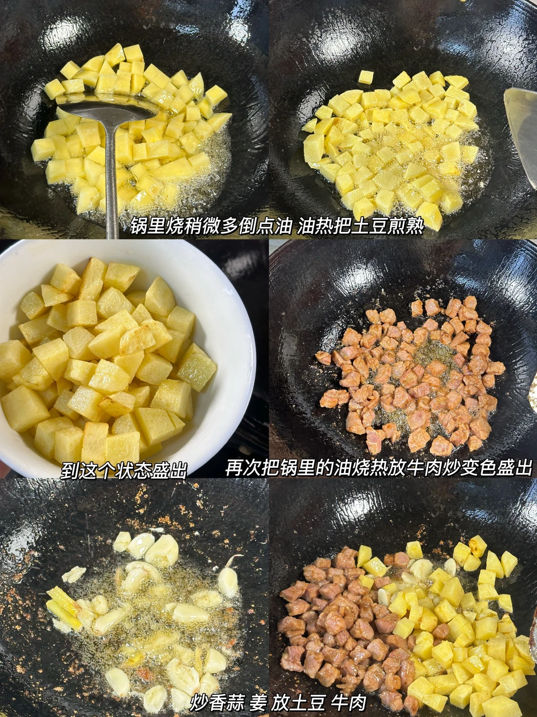 2️⃣:土豆🥔切成跟小方块后用清水多冲洗几遍。锅里倒比炒菜多一点的油烧热,放土豆平铺煎熟盛出。再次把油烧热 放牛肉快速滑变色捞出。