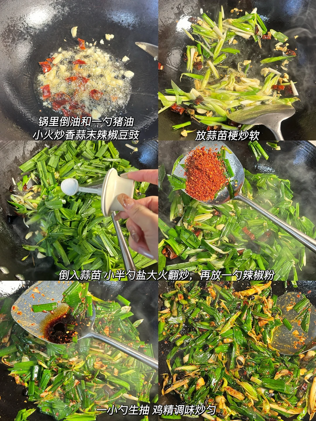 跟奶奶学的做法 真的太下饭了🤤 超简单快速 ✨食材:蒜苗 蒜 干辣椒 豆豉 1️⃣:锅里倒油,有猪油混一勺猪油。放蒜末豆豉 干辣椒小火炒香。再放蒜梗炒软,倒入蒜苗加小半勺盐炒几下。能吃辣的加一勺辣椒粉,一小勺生抽 鸡精调味大火翻炒匀。 记得多煮点米饭🍚 当个配粥小菜也很棒! 好好吃饭呀🤘🏻